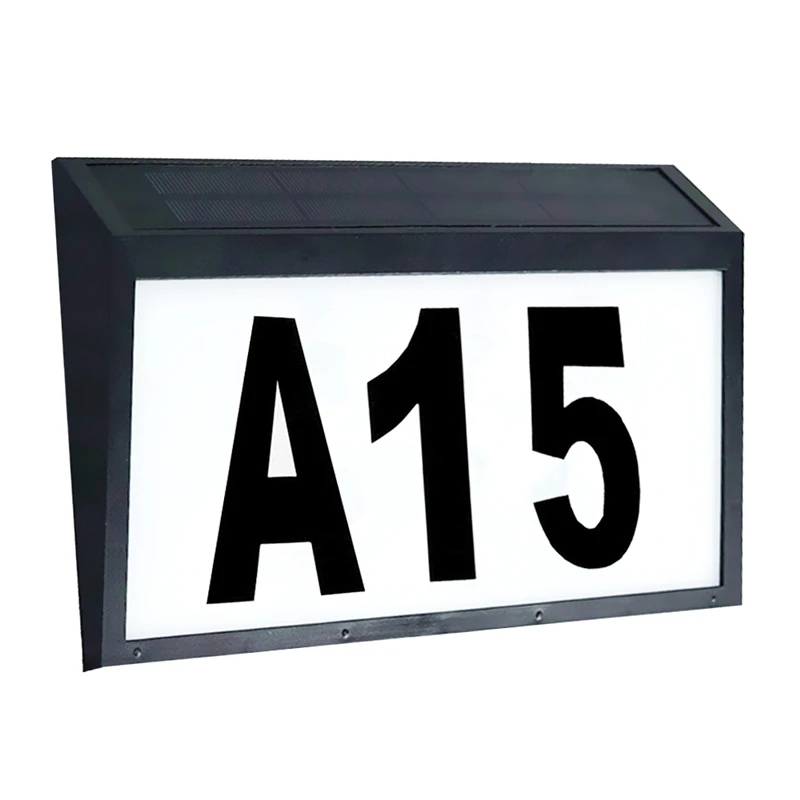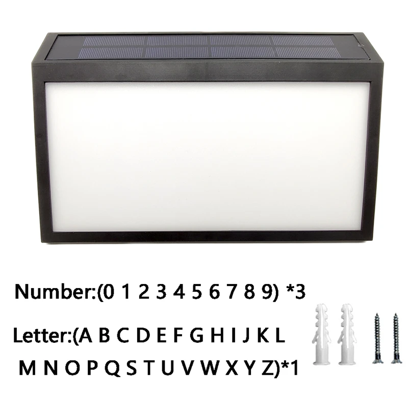 Product name:solar house number light Solar panel:Polycrystalline solar Battery:1.2V 1200mAh NiMh LED:10 pcs white LED SMT Sensor:Light sensor Working time:6-8 hours packing: 1 x Solar Address Light 2 Sets Numbers (0.1.2.3.4.5.6.7.8.9) 1 Set Character (A.B.C.D.E.....XY,Z.) 1 x User Manual 2 x Screws And Stopples 1 x Numbers Fixed Cardboard