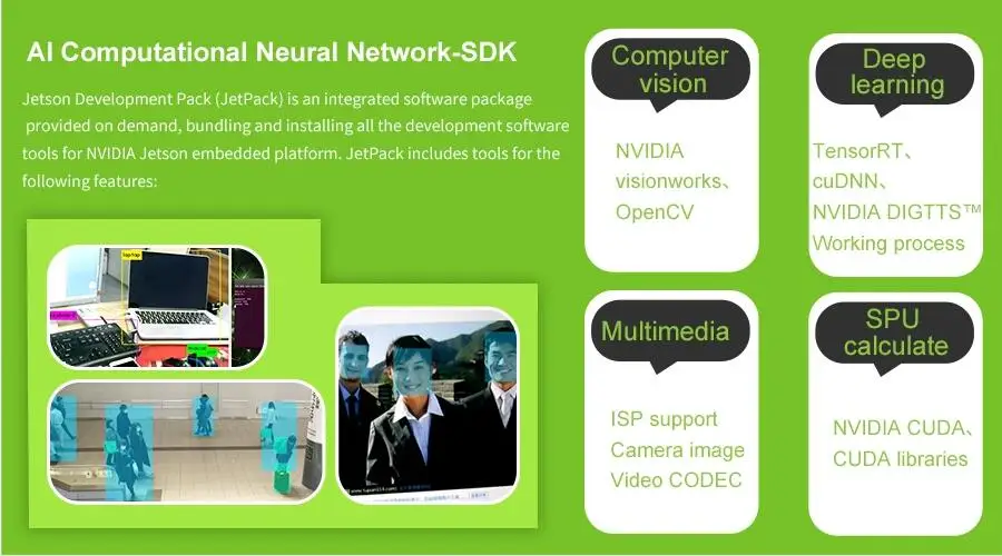 1. Небольшой, но мощный компьютер с большим количеством встроенных ресурсов. 2. Графический процессор: 128 ядер Maxwell GPU. ЦП: четырехъядерный процессор ARM Cortex-A57. Память: 4 Гб 64-разрядная LPDDR4. Хранение: слот карты Micro SD (рекомендуется карта TF 32G/64G) 3. Он может запускать несколько приложений, таких как нейронная сеть, распознавание изображений, определение цели и местоположение, обработка голоса и интеллектуальный анализ. 4. Jetson Nano может обрабатывать 8 HD видео-потоков в режиме реального времени и может использоваться на платформах анализа краев низкой мощности. 5. Jetson Nano также поддерживается NVIDIA JetPack, которая включает BSP, CUDA, cuDNN и TensorRT библиотеки программного обеспечения для глубокого обучения, компьютерного видения, GPU вычислений, мультимедийной обработки и многого другого. 6. Все виды платформ искусственного интеллекта могут быть использованы для создания автономных роботов и сложных систем искусственного интеллекта.