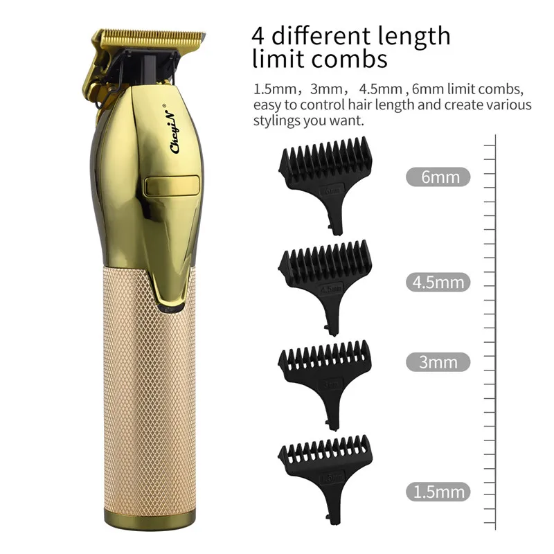 Product description: Voltage:100-240V,50/60Hz stable output,low noise metal housing design blade:professional steel blade blade width:40mm work:wired/wireless working charging method: USB indicator light:charging and working reminder 4 pcs limit comb:1.5/3/4.5/6 mm product length:155 mm user manual languages:English Content: cleaning brush*1 user manual*1 USB line*1 machine*1 comb*4 packing box*1