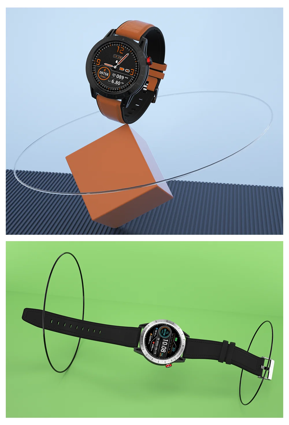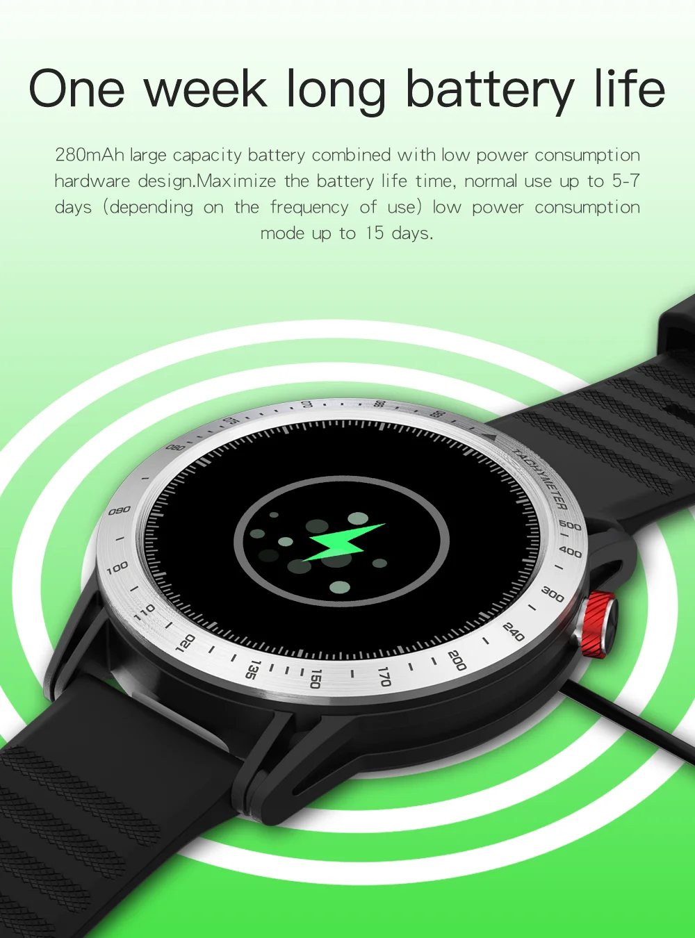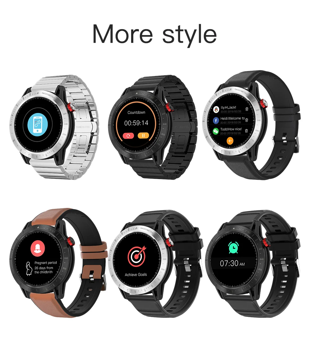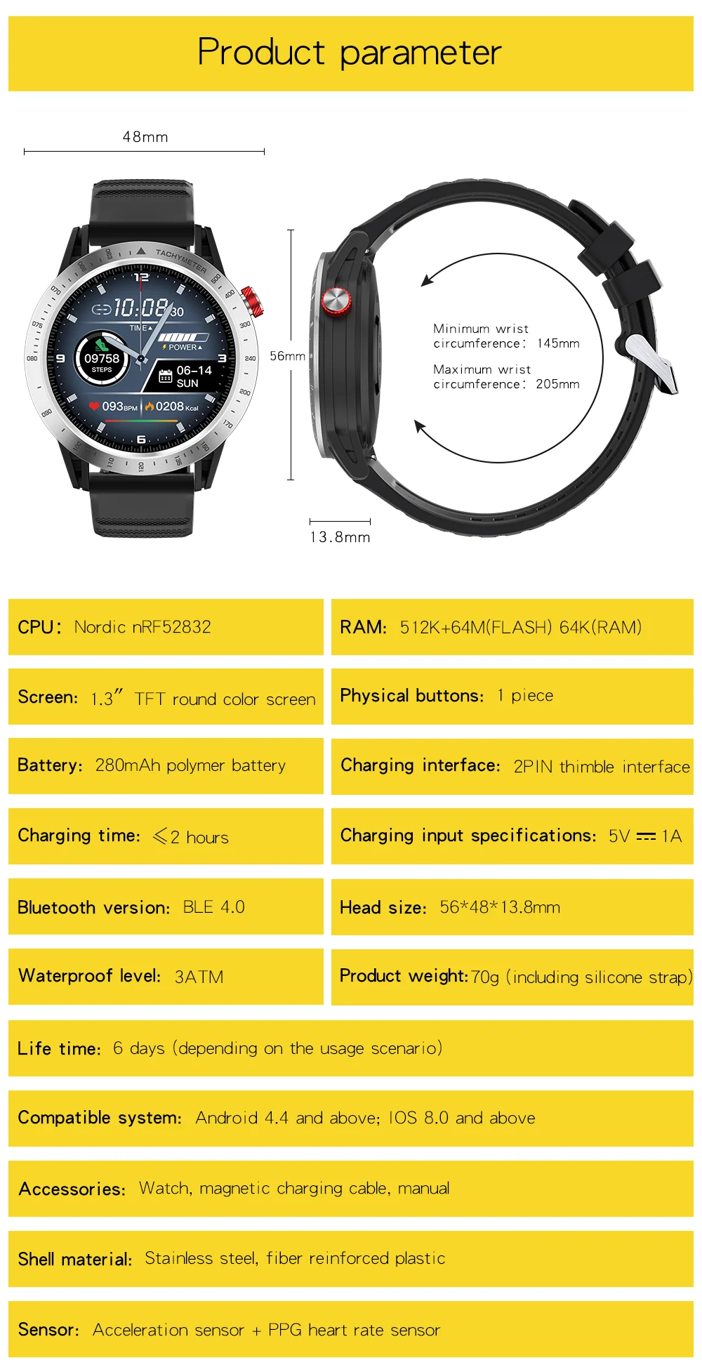 Спортивный стиль, в сочетании с изысканной традиционной технологией производства часов; Армированный волокном пластиковый корпус (такой же материал, как у GAR watch); Крышка из нержавеющей стали + процесс коррозии; 1,3-дюймовый чистого шелка круглый цветной экран + полный экран сенсорный; Водонепроницаемость 30 м (поддерживает плавание, но не нажимает кнопку под водой); Супер стабильное приложение, программное обеспечение и аппаратное обеспечение, точный счетчик шагов и алгоритм сна.