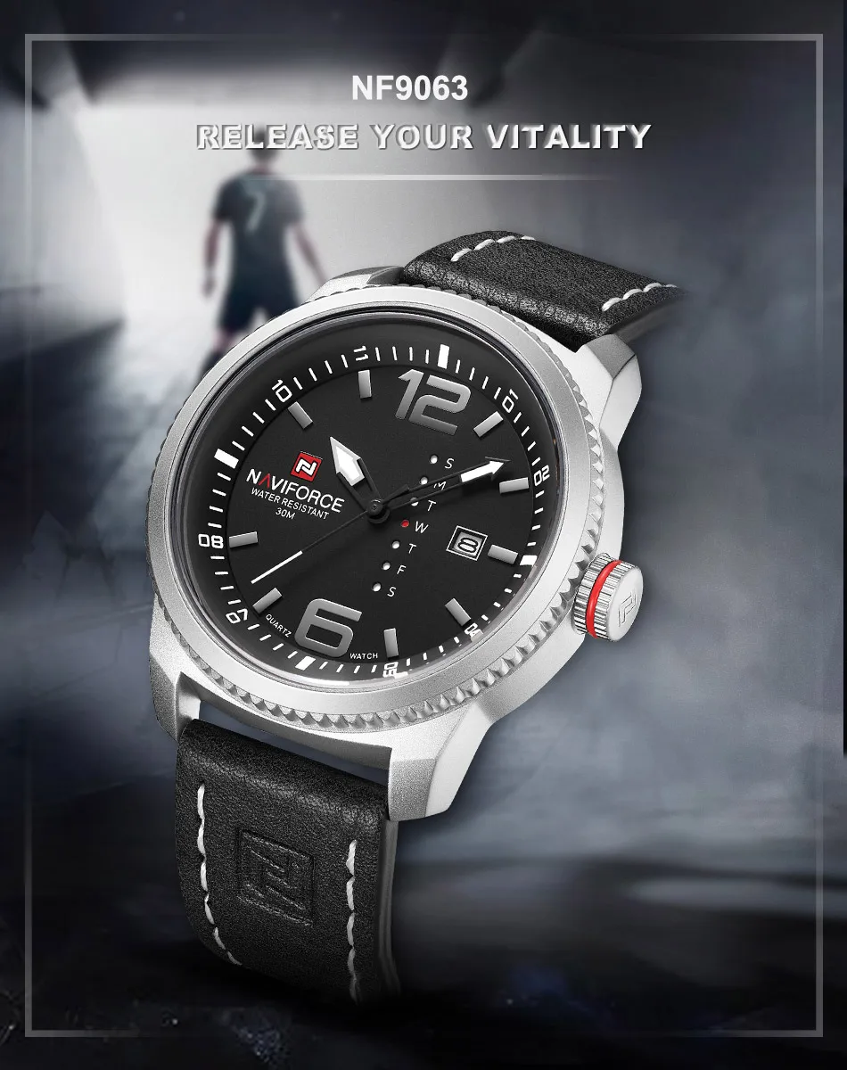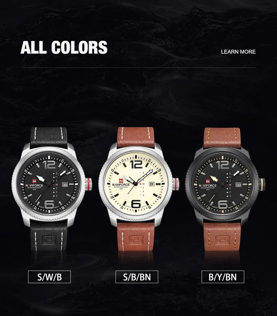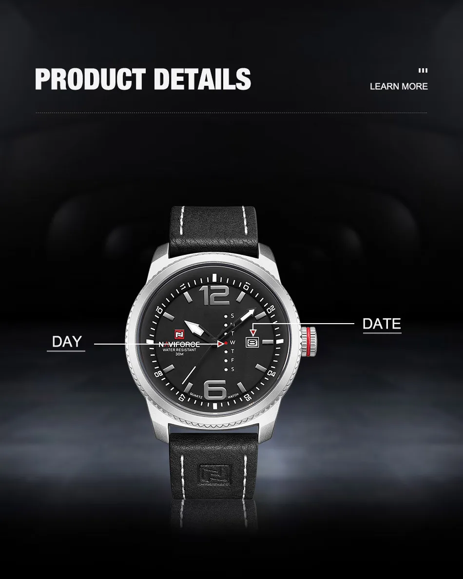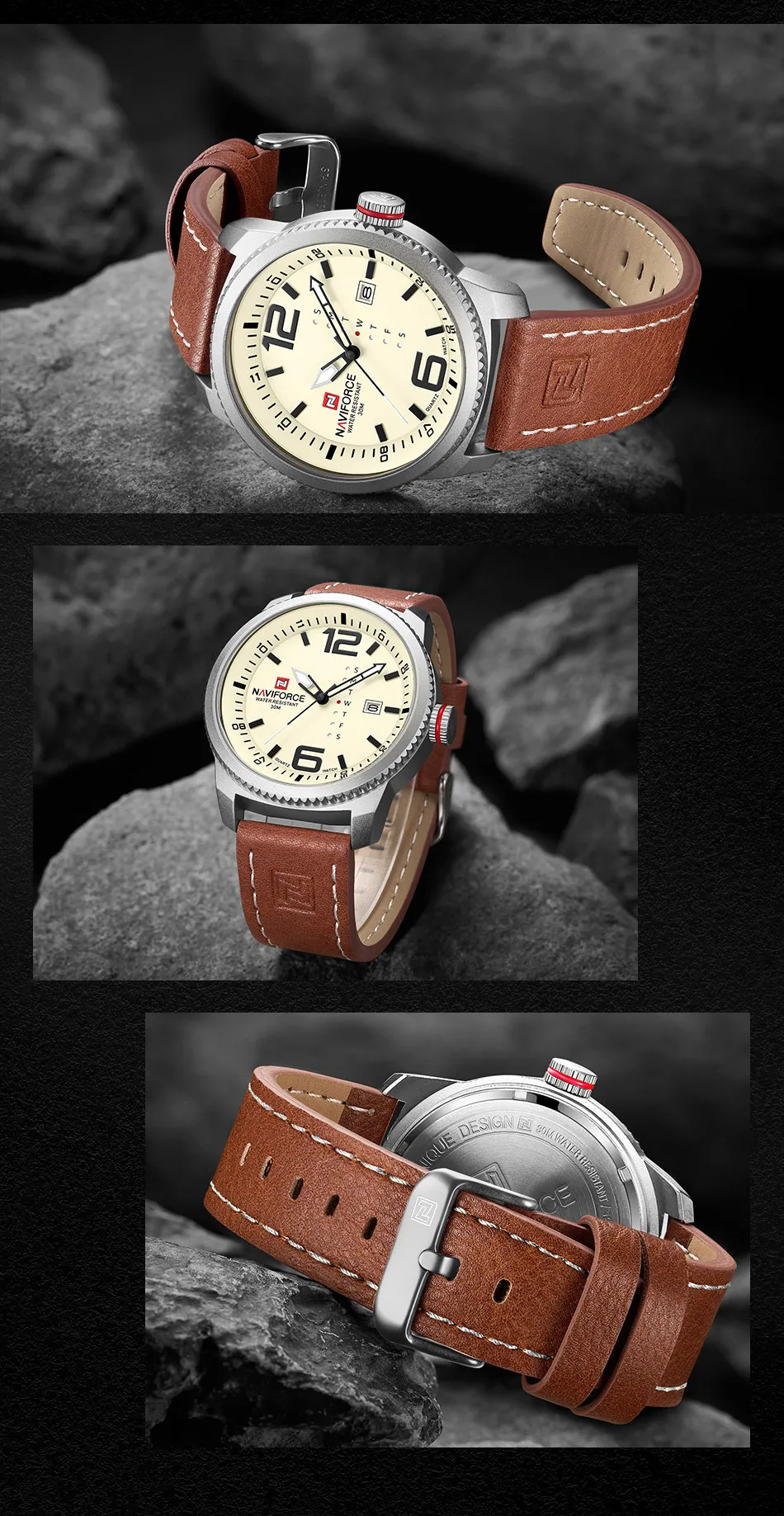 Описание 100% оригинальный новый и высококачественный Отображение дневного отображения и даты Светящиеся руки Высококачественный кожаный ремешок Водонепроницаемость 30 м Технические характеристики Материал корпуса: сплав Диаметр чехла: 47,5 мм Толщина чехла: 12,5 мм Материал ремешка: кожаный ремешок Длина ремешка (включая чехол): 260 мм Ширина ремешка: 24 мм Вес изделия: 82 г Что входит в комплект Оригинальный Креативный новый бренд NAVIFORCE 100%