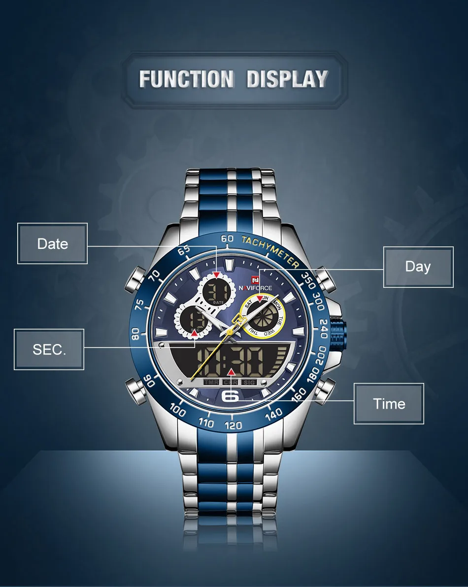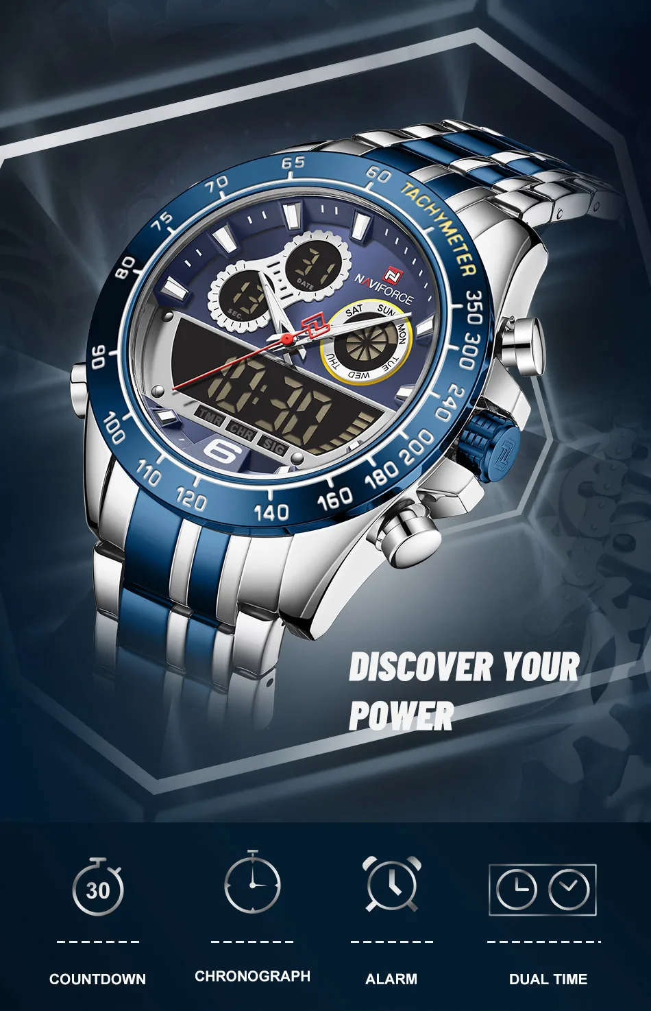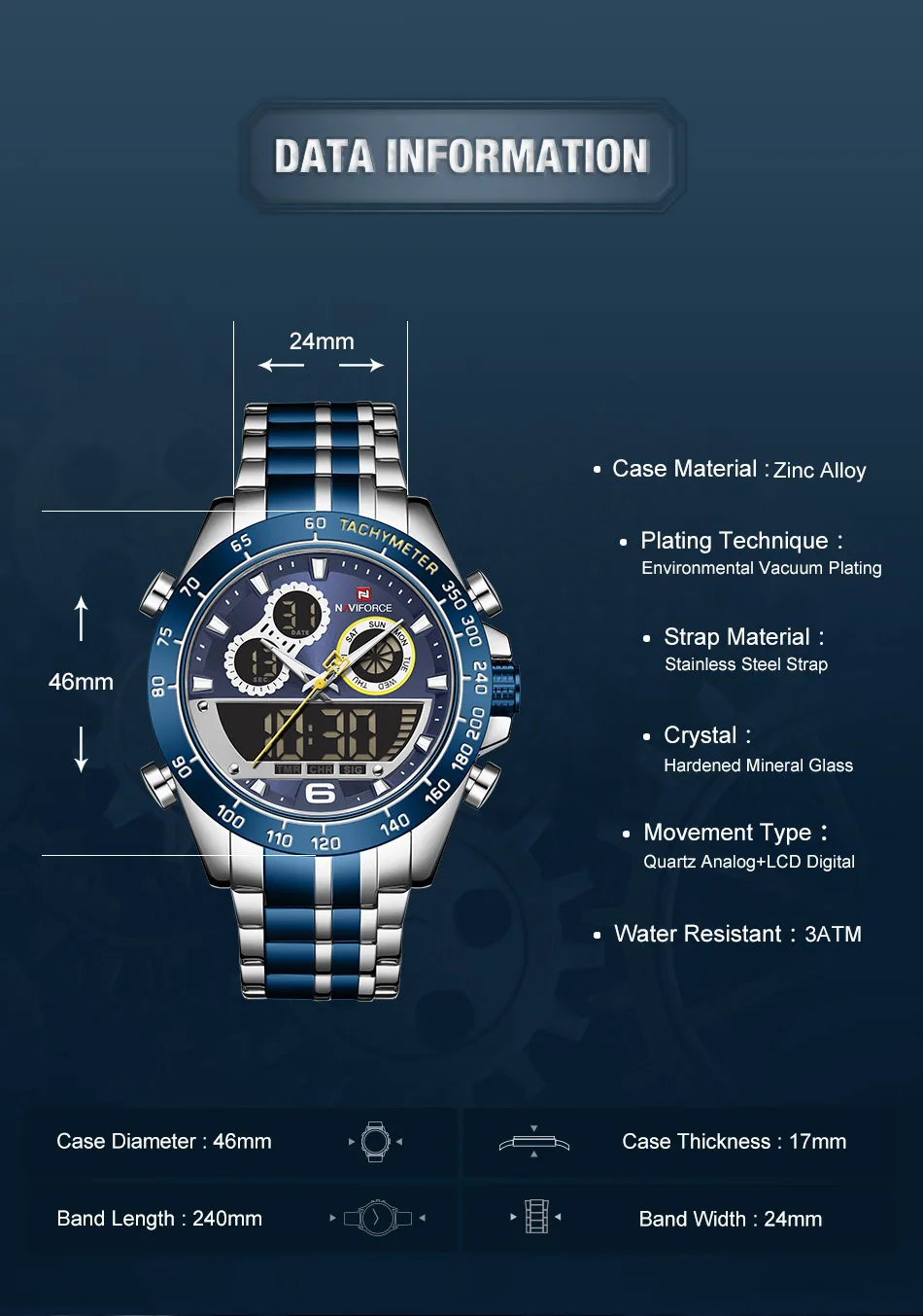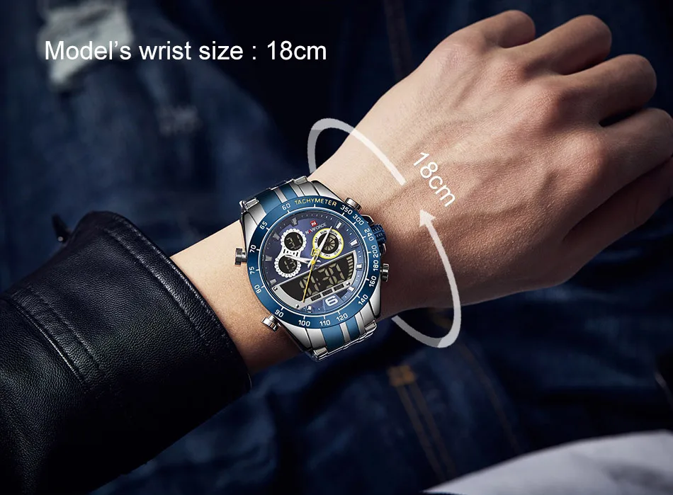 Описание продукта: 100% оригинал новый и высокое качество Будильник с 4 мин, Повтор Отображение дня, даты и времени Chrime на каждый час Хронограф с круговым механизмом и 1/100 Двойное Ядро движения Аналоговый и цифровой светодиодный дисплей Функция EL (синий) Ежечасная Мелодия курантов, Функция Нержавеющая сталь ремень Защита от воды на глубине до 30 м Reistant Технические характеристики Материал корпуса: сплав Чехол Диаметр: 46 мм Чехол Толщина: 17 мм Материал ремешка: ремешок из нержавеющей стали Длина ремешка (включая чехол): 240 мм Ширина ремешка: 24 мм Вес изделия: 190 г Что входит в комплект 100% новый бренд NAVIFORCE 1 x аналоговый и цифровой дисплей с будильником и EL Blue Function Watch