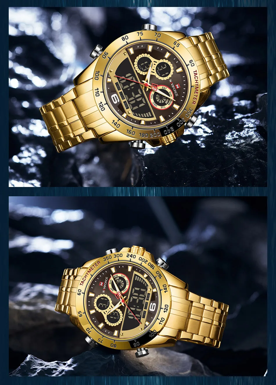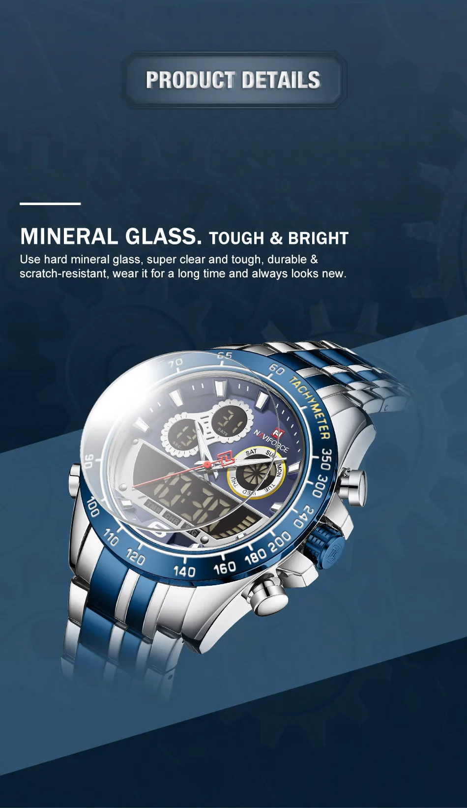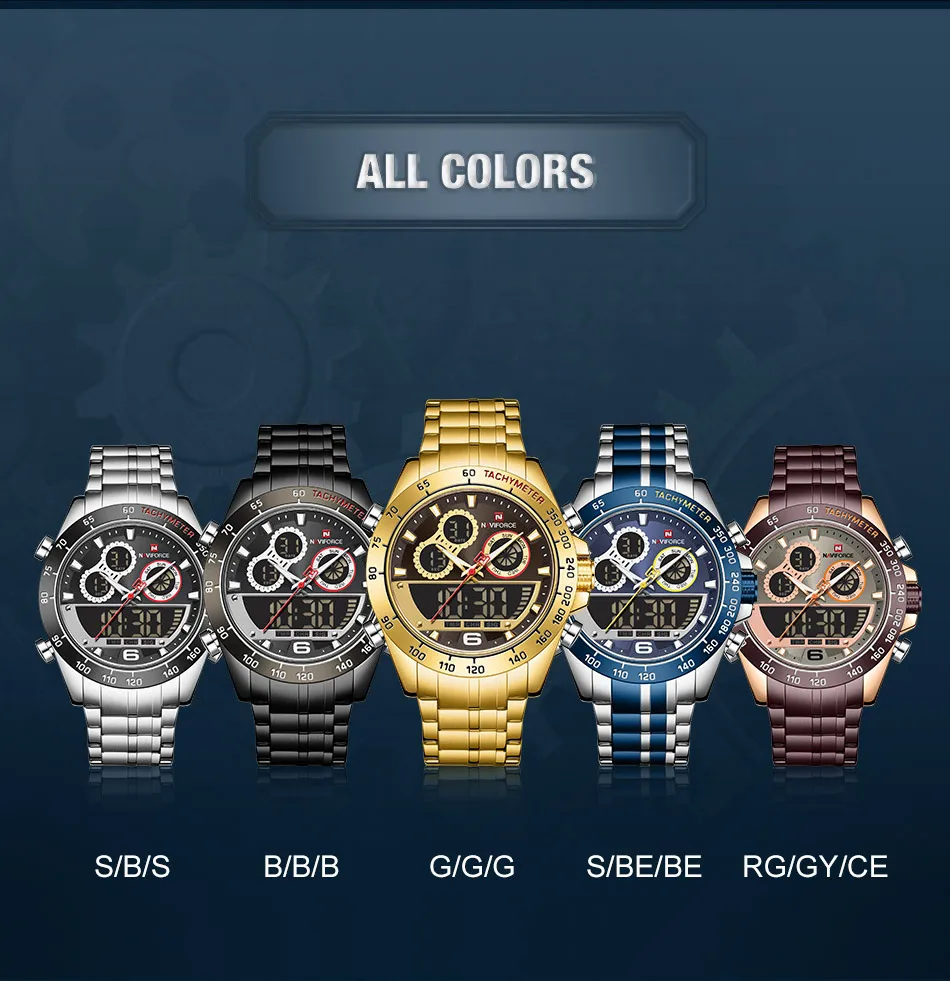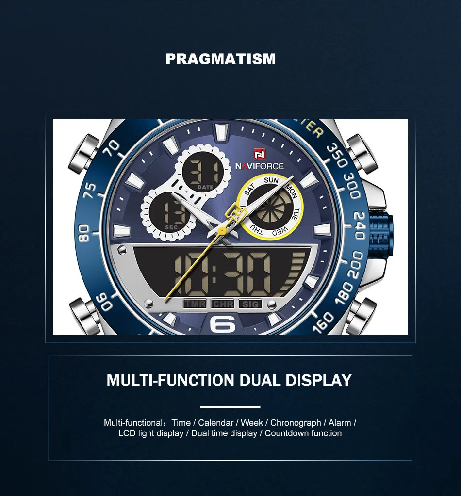 Описание продукта: 100% оригинал новый и высокое качество Будильник с 4 мин, Повтор Отображение дня, даты и времени Chrime на каждый час Хронограф с круговым механизмом и 1/100 Двойное Ядро движения Аналоговый и цифровой светодиодный дисплей Функция EL (синий) Ежечасная Мелодия курантов, Функция Нержавеющая сталь ремень Защита от воды на глубине до 30 м Reistant Технические характеристики Материал корпуса: сплав Чехол Диаметр: 46 мм Чехол Толщина: 17 мм Материал ремешка: ремешок из нержавеющей стали Длина ремешка (включая чехол): 240 мм Ширина ремешка: 24 мм Вес изделия: 190 г Что входит в комплект 100% новый бренд NAVIFORCE 1 x аналоговый и цифровой дисплей с будильником и EL Blue Function Watch