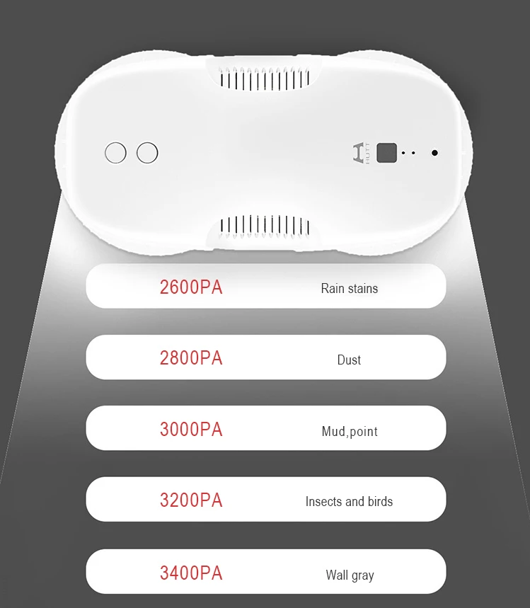 HUTT лущильная машина всасывания инноваций Распознавать различные уровни загрязнения. Автоматически регулировать всасывание. Отказаться от скольжения. Не повреждает стекло. 2600PA дождевых пятен 2800PA песок 3000PA грязи точка 3200PA насекомые птицы 3400 ПА настенное серого цвета