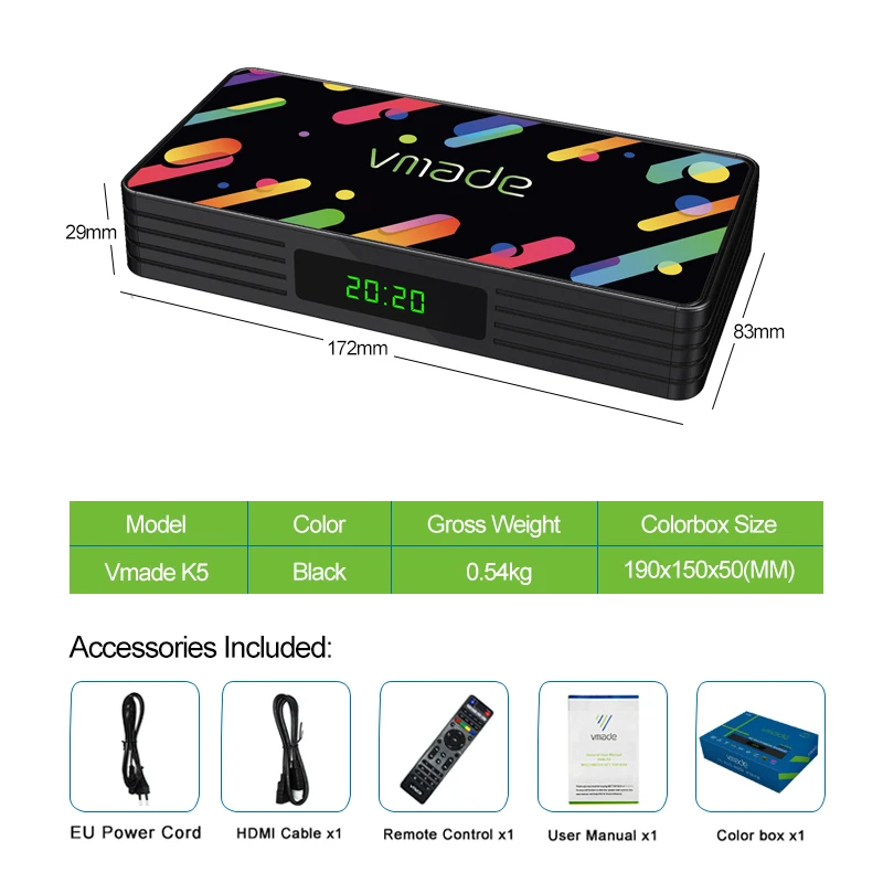 Основной чипсет MSA7T10E (высокопроизводительный SoC чипсет для HD Set Top Box) Встроенная память DDR 512 Мб DDR2 Флэш-память 4M байт Тюнер Rafael R836 Входная частота RF 48 ~ 866 МГц Входной уровень-83 - -5dBm "DVB-T/T2 Демодулятор "" • совместим с DVB-T (ETSI EN 300 744) и DVB-T2 (ETSI EN 302 755) • Принять ниже, если входы в 1,7/5/6/7/8 мг канал ширина полосы • Поддерживает все интервалы защиты (DVB-T 1/32 до 1/4, DVB-T2 1/128 до 1/4) • Поддерживает все режимы FFT от 1K до 32K • Поддерживает все созвездия (QPSK, 16-QAM, 64QAM, 256-QAM) • Поддерживает все длинные и короткие скорости кода блока (1/2, 3/5, 2/3, 3/4, 4/5, 5/6, 2/5, 1/3) • Сверхбыстрое автоматическое сканирование каналов UHF/VHF "Мульти-стандарт Видео декодер "" • H.265 видео декодер (поддерживает разрешение до 1920x1080 @ 60fps) Поддерживает декодирование видео HEVC/H.265. Поддержка одновременной 8-бит/10bit глубину цвета. Поддерживает основной/основной-10 профилей, уровень 4,1, более высокий уровень. • Декодер H.264 (поддерживает декодирование MVC 3D до 1080p @ 30 кадров в секунду) • VC-1 декодер, MPEG-1/2/4 видео декодер Поддерживает разрешение до HDTV (1080p @ 30fps, 1080i, 720p) и SDTV" "Мульти-стандарт Аудио декодер "" • поддерживает MPEG-1/2 (LayerⅠ/Ⅱ), MP3, ACⅢ, EACⅢ, AAC-LC, HE-AAC WMA, RA8-LBR декодирование цифрового аудио. • Поддерживает выход ACⅢ stream через SPDIF. • Преобразование частоты дискретизации звука (SRC)" "Аудио и видео Выходной интерфейс "" • Встроенный стереоdac для линейного выхода. • Поддерживает Композитный Выход 480i и 576i CVBS. • Цифровой видеокодер поддерживает все стандарты NTSC/PAL/SECAM TV • Поддержка TTX/CC/WSS/CGMS-A (teletext/subtitle) • Выход HDTV поддерживает глубину цветопередачи 8/10/12 бит на канал и Разрешение до 1080p @ 60fps или 720p/1080i @ 120Hz." Формат видео поддерживает mov/.avi/.ts/.mkv/.trp и т. Д. "Формат изображения "Поддерживает JPEG, BMP, PNG Особенности Sortware • Подключение к сети поддерживается через USB Wi-Fi ключ MT7601 или Ethernet-кабель • Сетевое приложение поддерживает YouTube, IPTV (протокол), загрузка FTP (программное обеспечение для онлайн-обновления) • Поддержка программного обеспечения для онлайн-обновления (только Vmade brand prodcut поддерживает эту функцию) "• MeeCast: (Опциональная функция оплаты) (1) мобильный телефон RCU, местное медиа-литье, DLNA, Miracast (2) поддерживает общий доступ к большому ТВ-экрану через смарт-мобильный телефон (видео/музыка/фото). (3) поддерживает дистанционное управление приемником телевизора через смарт-мобильный телефон пользователя. (4) поддерживает светильник IoT (работает с определенной моделью ip-камеры) (5) поддерживает просмотр YouTube/TED/Vimeo/Facebook/..., все больше и больше веб-сайтов будут поддерживать». • Поддержка обновления программного обеспечения STB с помощью флеш-накопителя USB (необходимо восстановить заводское по умолчанию после обновления). • Поддерживает функции переключения времени, PVR и мультимедийного воспроизведения (USB флэш-накопитель или жесткий диск). • Поддержка 7 дней электронных программ (EPG). Поддерживает напоминание о расписании EPG. • Поддержка нескольких языков OSD на английском, итальянском, чешском, хорватском, нидерландском, французском, испанском, немецком языках • Дисплей двигателя: встроенный контроль контрастности и яркости. • Соотношение сторон: 16:9 коробка/Pan G Scan/широкий экран, 4:3 коробка букв/Pan G Scan/Full. • Разрешение видеовыхода: 480i/576i/480p/576p/720p/1080i/1080P • Поддерживает таймер сна.