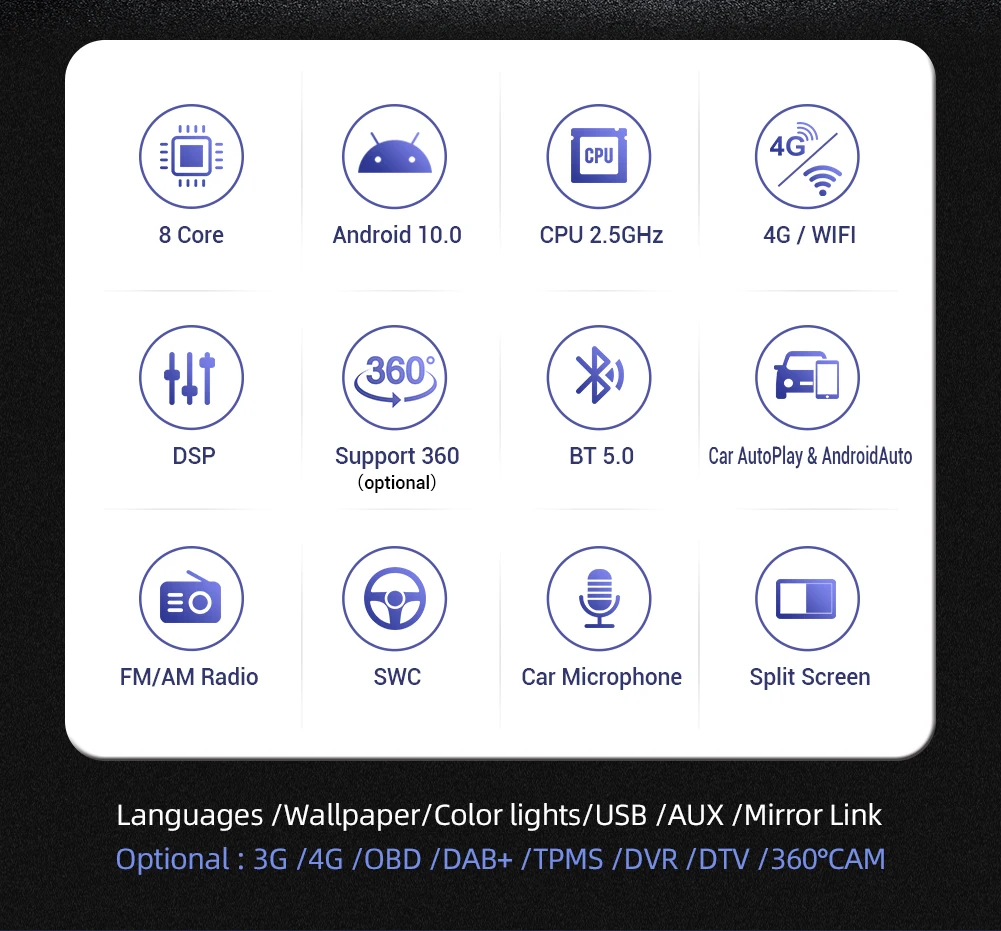 Сенсорный экран + радио + FM/AM + RDS + gps-навигация + карта + Wifi + Bluetooth + управление рулевым колесом + сплит-экран + USB + SD + AUX вход/выход + зеркальная ссылка + задний камера + сабвуфер + Play Sore + EQ + набор обоев + логотип автомобиля + 3G/4G + TPMS + DAB + OBD 2 + DVR + TV