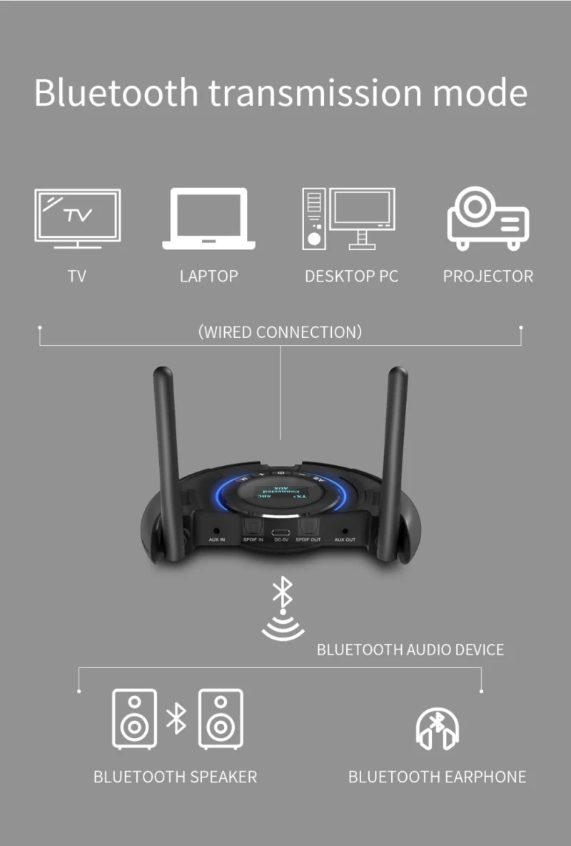 4. Режим передачи может быть одним для двух (можно подключить две Bluetooth гарнитуры), режим передачи может хранить до 4 устройств, и режим приема может хранить до 8 устройств