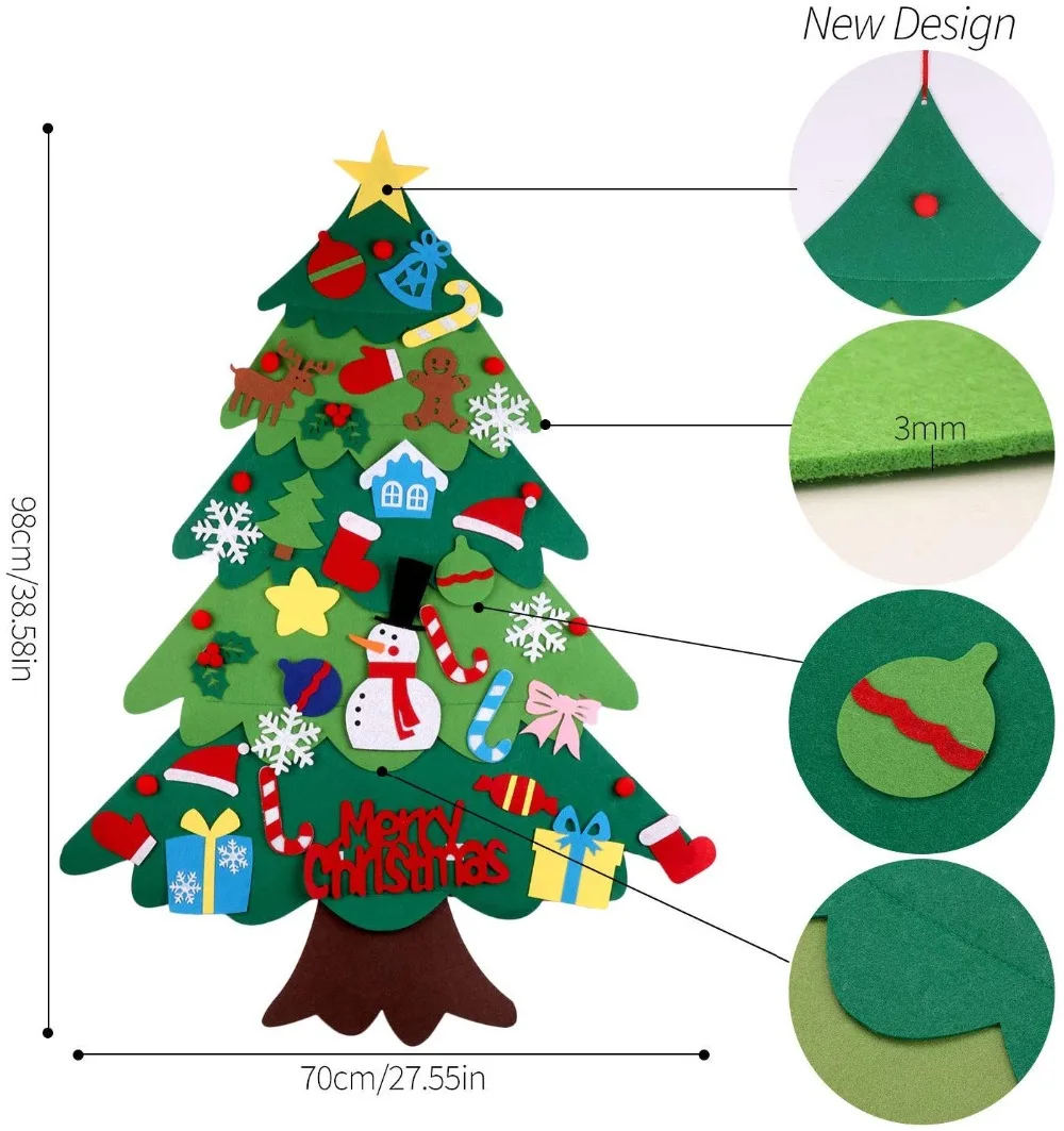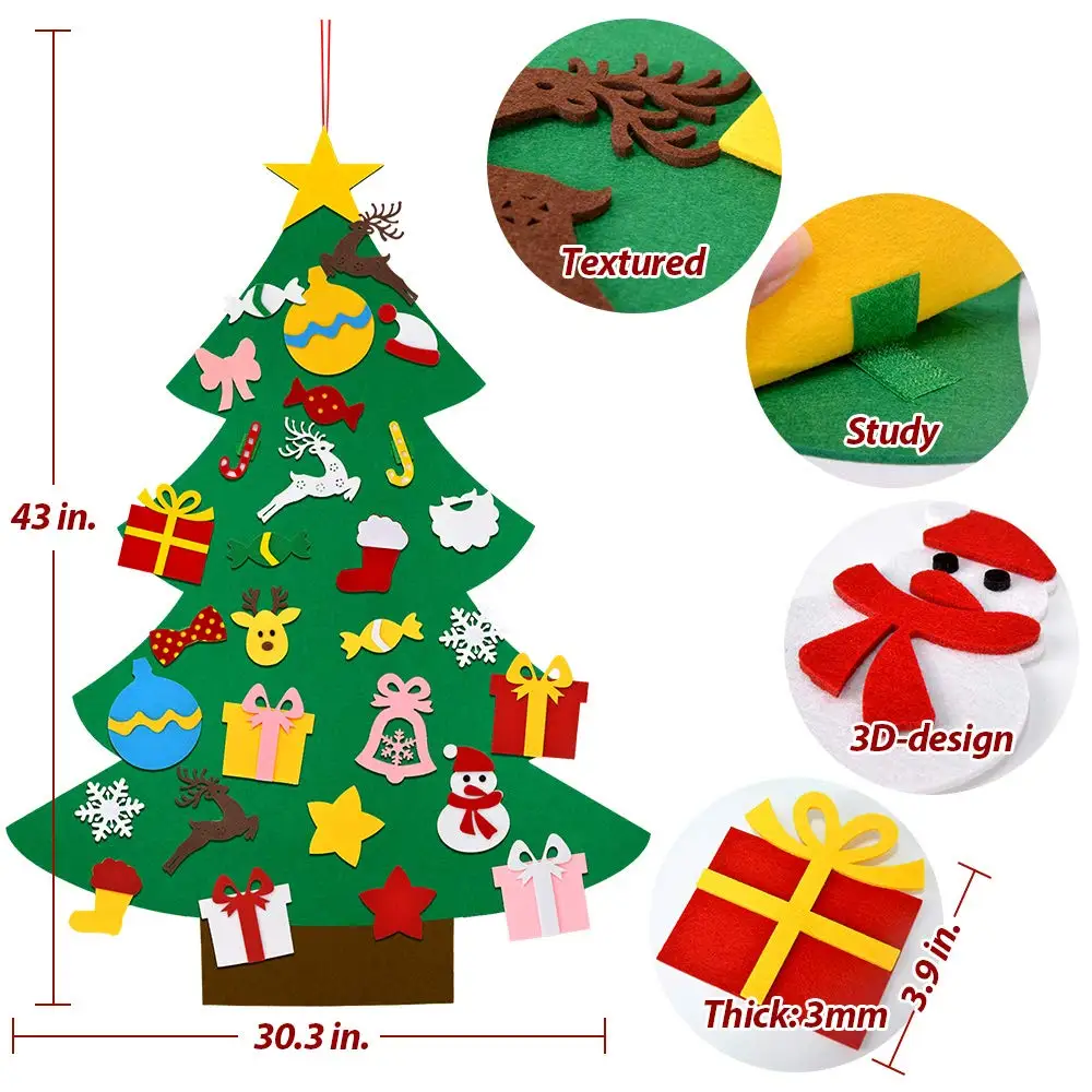 1. Войлочная Рождественская елка «сделай сам»: модернизированная многослойная 3D войлочная елка «сделай сам» + 32 различных украшения; Украшения включают снежинки, Санта-Клауса, оленей, рождественские чулки, снеговика, конфеты и колокольчики.