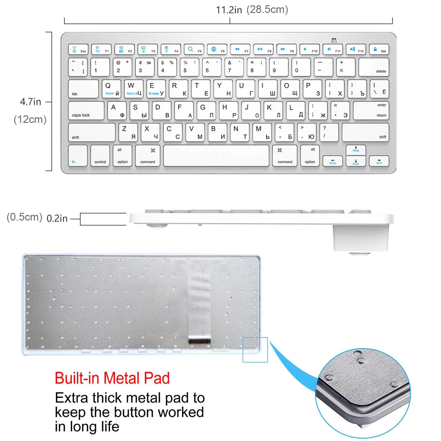 Bluetooth-клавиатура работает с iOS, Android, Mac os (некоторые мультимедийные функциональные кнопки не совместимы) и Windows, с помощью клавиш быстрого доступа для всех четырех систем. Для Apple iPad Air, iPad 4 / 3 / 2, iPad Mini 4, iPhone 7Plus/7/6S/6 Plus, Galaxy Tab ,Galaxy Note, поверхность и многое другое (несовместимо с таблетками Nook)