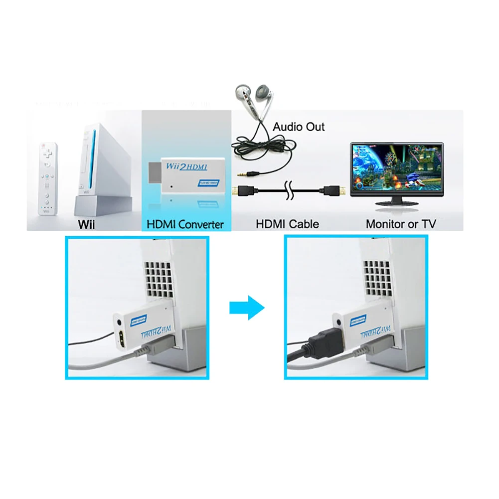 -WII может выводить сигнал HDMI, непосредственно подключенный к монитору артефакт. Также позволяет WII напрямую подключать компьютерные колонки и наушники, нет питания и USB питания, подключи и работай.