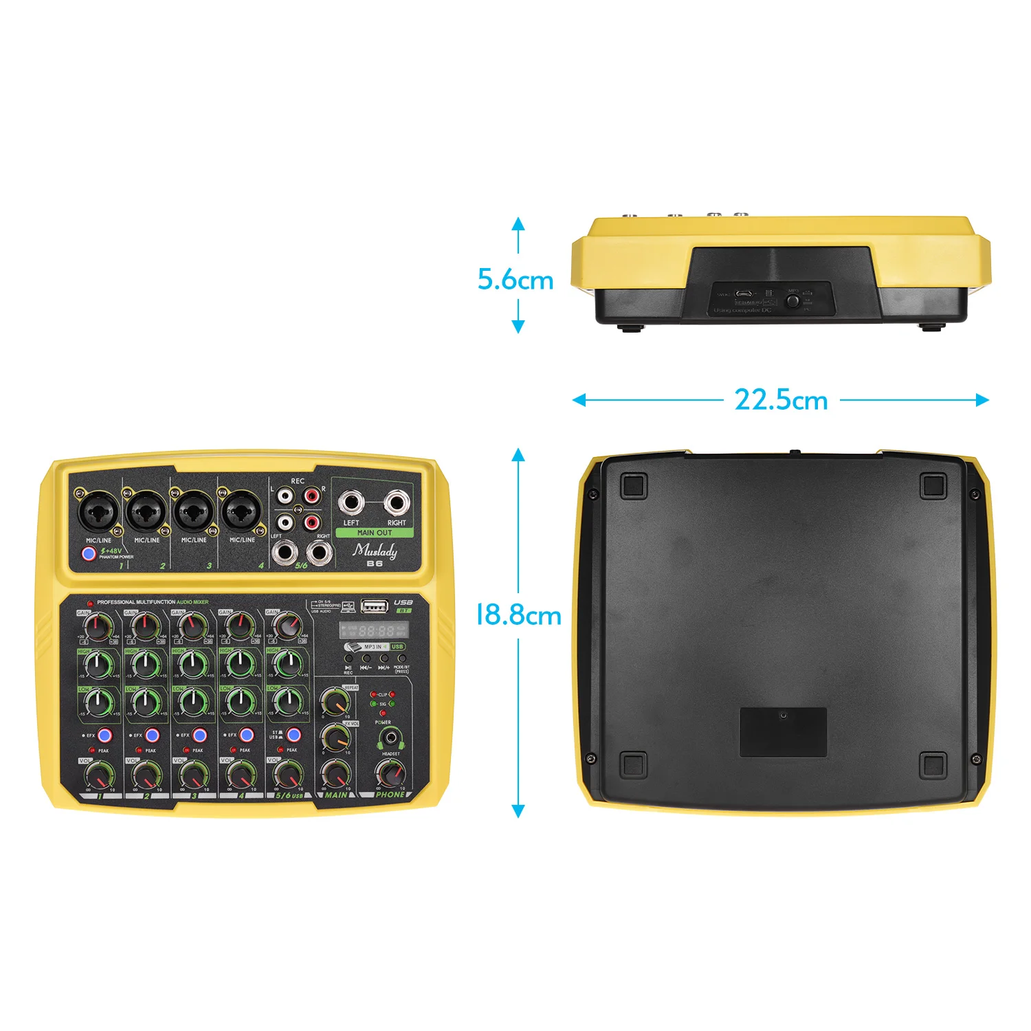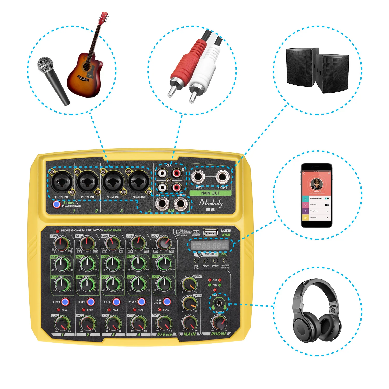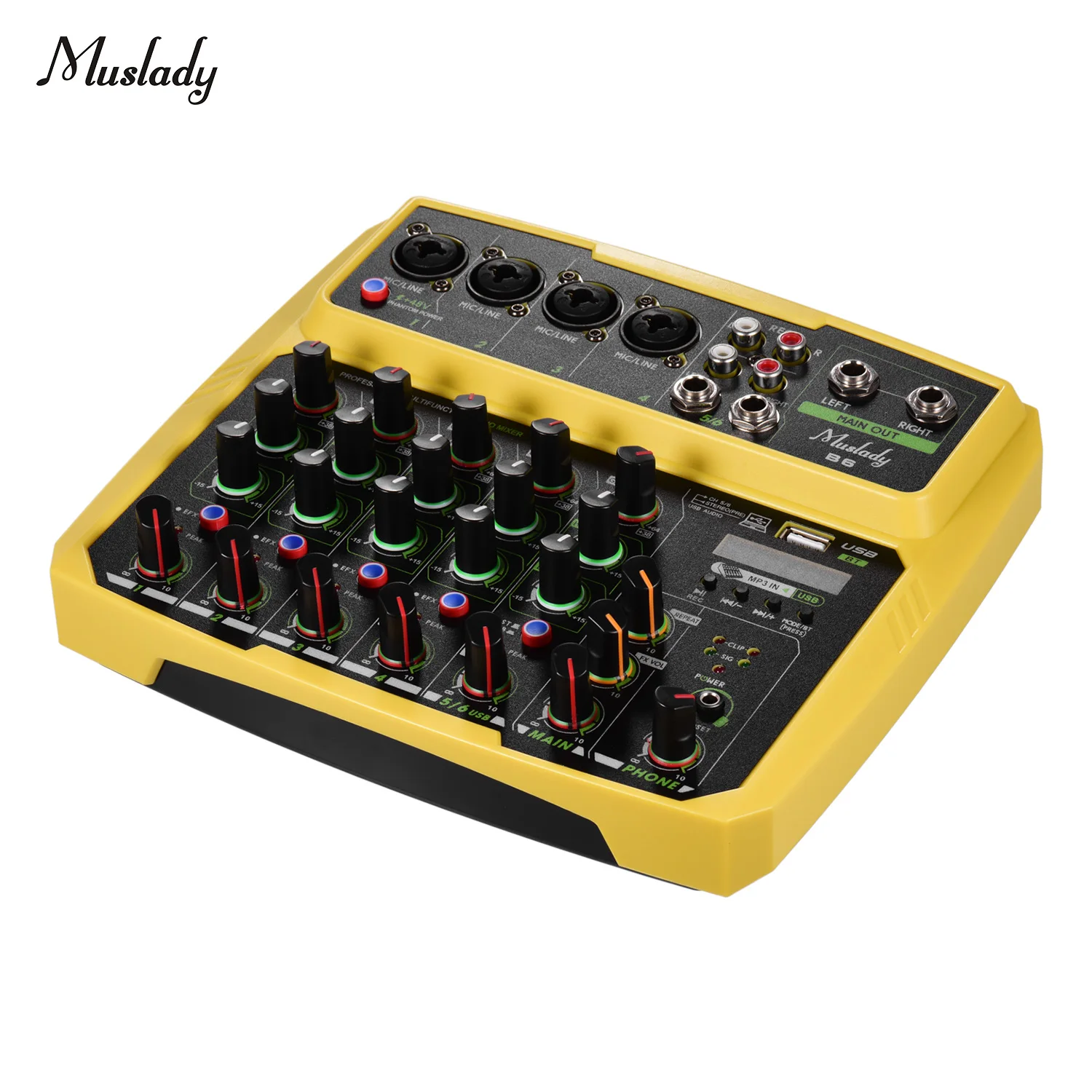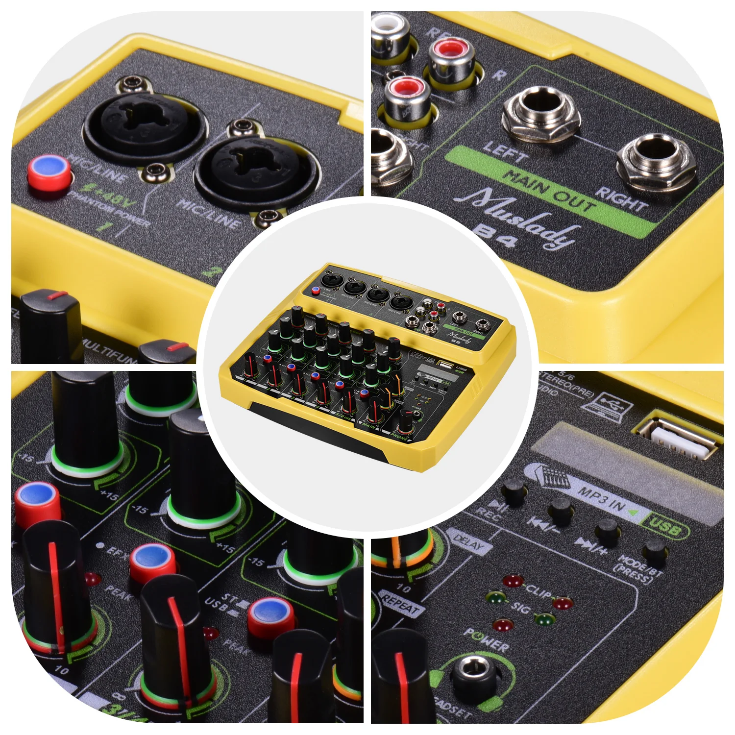 Этот микшер оснащен входным усилением, 2-полосным эквалайзером (высоким/низким) и регулировкой громкости, кнопками задержки и повторного управления.