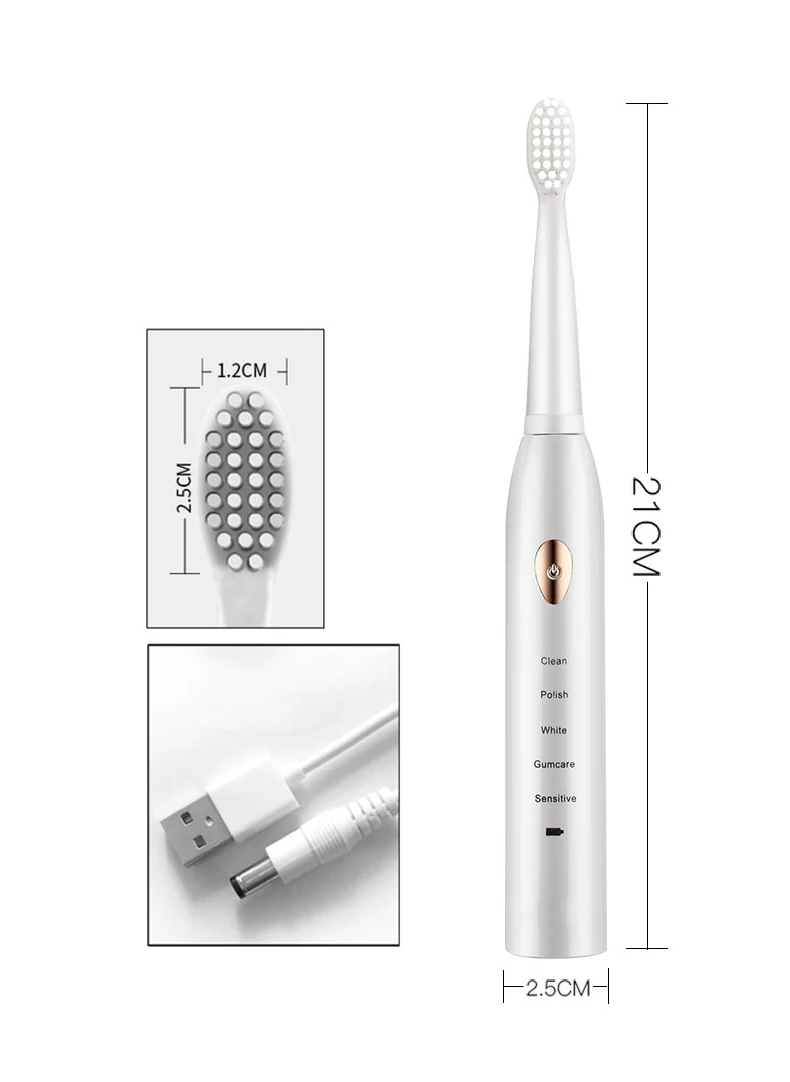 1. 5 различных режимов очистки, наиболее подходящих для чувствительных зубов 2. С 34000 микрощетками в минуту мощная звуковая технология 3. Класс водонепроницаемости IPX7 4. Мягкая щетина dupont США 5. 2-минутный умный таймер 6. Зарядка через USB, батарея работает 15 дней
