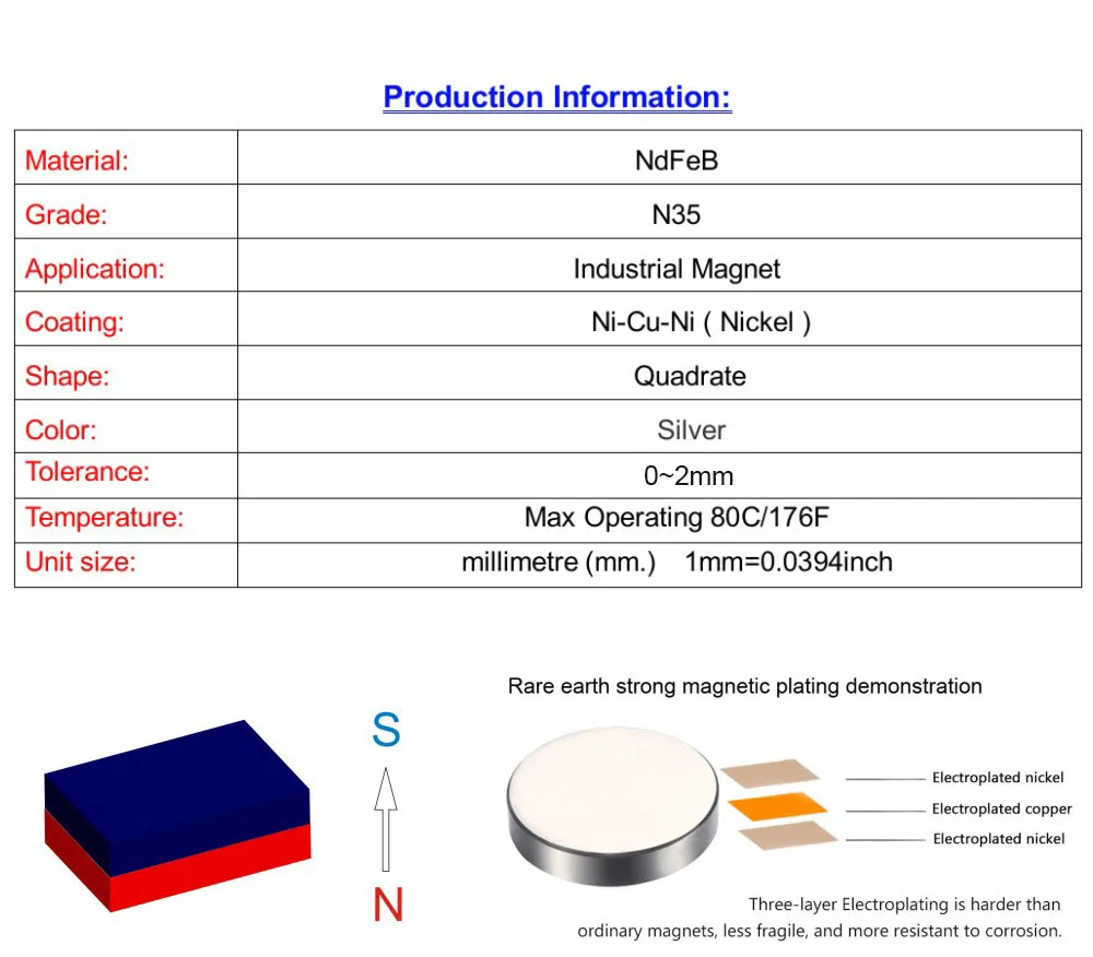 NOTICES: 1. Due to the special nature of the magnet and the artificial measurement. Actual dimensions are subject to physical measurements. 2. The magnet have Wide range of uses .Perfect for sticking notes on fridge doors. whiteboard fixing,adsorption of various steel parts,fixing tissue box on the roof, ideal for DIY projects,etc.Cause the big super magnetic,don't let the kid touch it. 3. Related electronic products, such as Mechanical watchs ,bank cards, mobile phones, computers, televisions, pacemakers, etc., they are easily affected by neodymium magnets, please maintain a certain distance, so as to avoid unnecessary losses. 4. NdFeB magnets are fragile, the characteristics are hard and brittle, especially large-size products, strips and thin slices, separate the magnet, please carefully shift staggered, must not break the hard pry, so as not to damage the product or injured , Separated to maintain a certain distance, so as not to touch the collision, damage to the product, or even dangerous. 5. Neodymium magnets are usually coated Nickel-Copper-Nickel plating to prevent the iron from rusting. If not used in time, be sure to keep away from the high temperature and corrosive environment,although there is a coating on the surface of the magnet. 6. If you have any questions, please keep good communication with us.