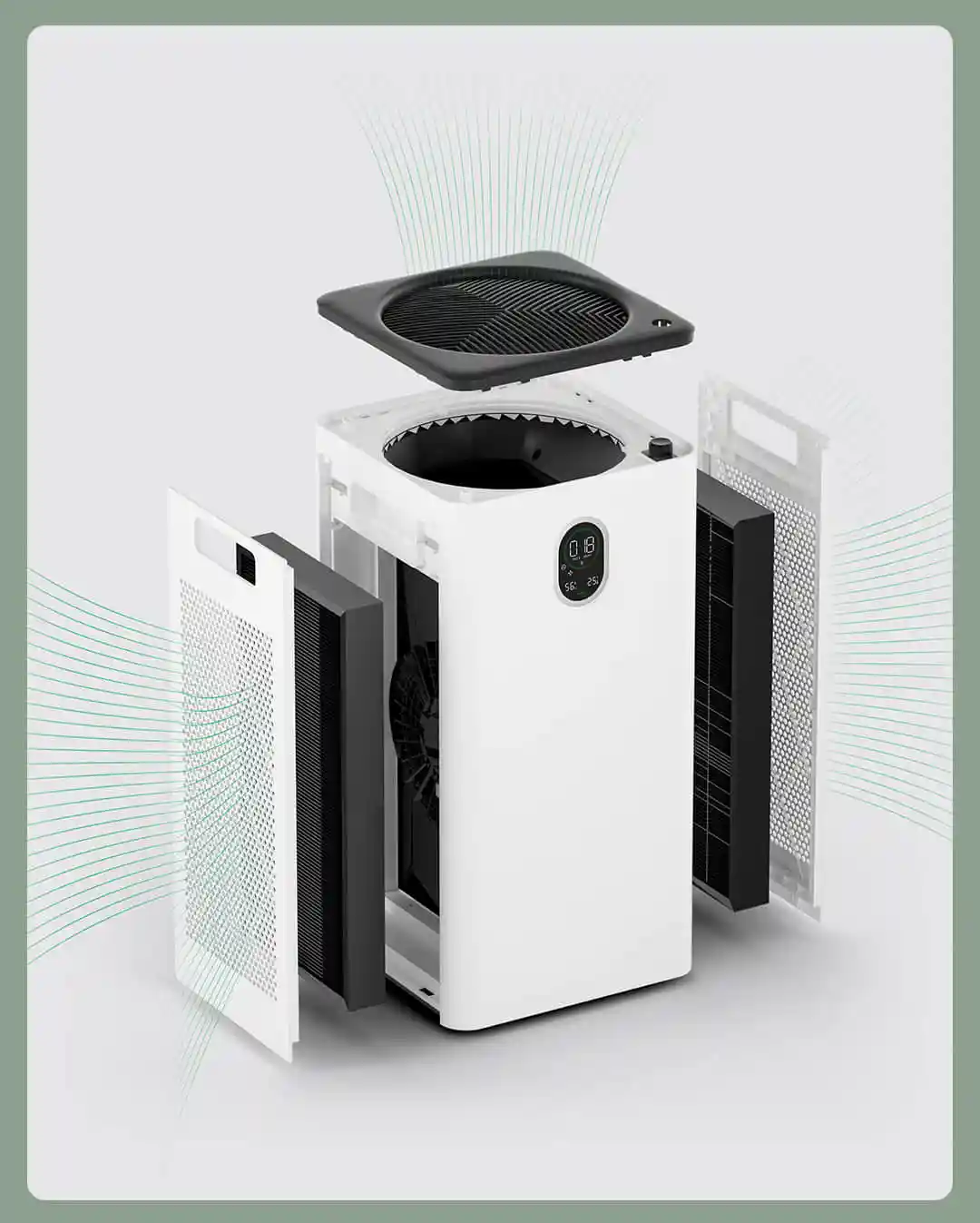 Высокоэффективный активированный уголь, Быстрый захват вредных газов, H12 уровень HEPA фильтр, скорость очистки частиц выше 0,3 мкм достигает 99.5%, что может эффективно удалить пыльцу, вторичный дым, пыль, частицы PM2.5, очищают и фильтруют бактерии, плесень и аллергены