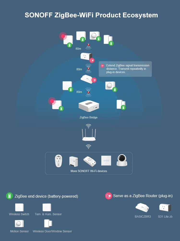 SONOFF ZigBee Bridge-это сердце умного дома, которое позволяет удаленно управлять различными устройствами и сенсорами ZigBee для мониторинга и контроля дома, И позволяет создавать умные сцены, чтобы смарт-Устройства Wi-Fi и ZigBee общались, чтобы получить доступ к умному дому и контролировать их все с помощью приложения eWeLink. Это увеличивает эффективность до 32 подключенных подустройств, которые являются переключателями на основе ZigBee, вилками и датчиками безопасности.Смарт-переключатель SONOFF BASICZBR3 Wi-Fi,S31 zb Lite smart plugБеспроводной переключатель SONOFF ZigBee и датчики, такие как датчик температуры и влажности, датчик движения и беспроводной датчик двери/окна, могут быть подключены к мосту, чтобы дать вам возможность создавать различные связи сцены. Что касается большего количества поддерживаемых устройств, мост также может работать с смарт-переключателем, датчиком температуры и влажности, motion, беспроводным датчиком двери/окна и датчиком воды, которые сертифицированы ZigBee Alliance. Сопряжение всех подустройств одним нажатием, быстрее, чем сопряжение Wi-Fi. Он поддерживает добавление камеры на мост или подустройства, удобно просматривать ваш дом на любом из них. Также можно использовать Alexa или Google Home для голосового управления вашим домом.