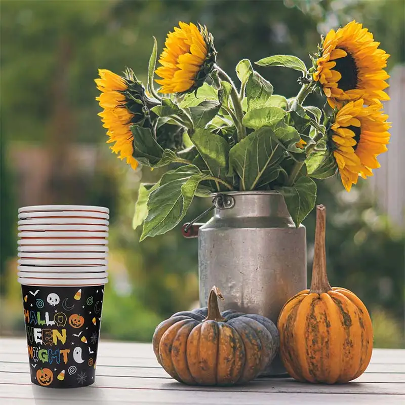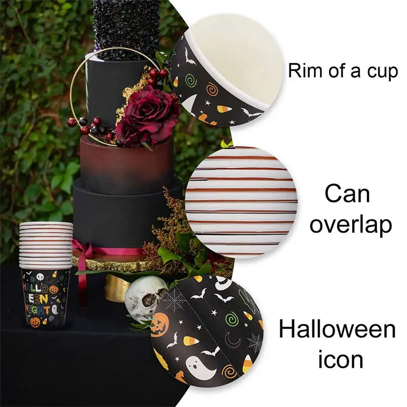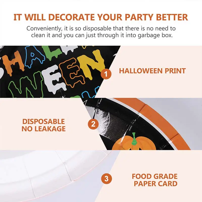 Consists of 24pcs 7 inches paper plates, 24pcs paper cups and 24pcs napkins, features with Halloween themed design, chic and attractive.