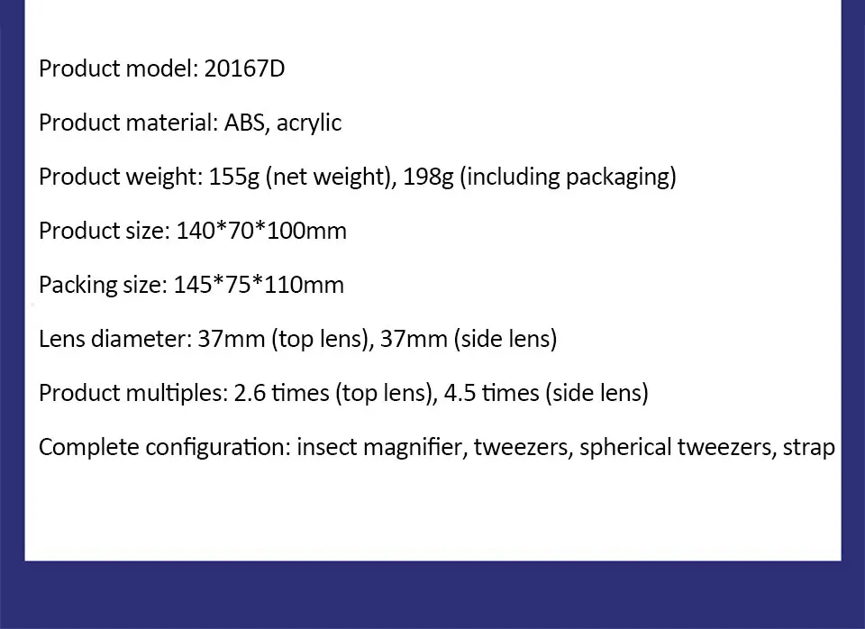 1. Оснащен шнурком для шеи, легко носить с собой и хранить; 2. Детям понравится его красочный дизайн коробки; 3. Захватывайте насекомых или других насекомых и наблюдайте за лупой с крышкой, которая также имеет паяльные отверстия; 4. Легко использовать для детей; 5. Может использоваться для наблюдения за живыми насекомыми, цветами, листьями, монетами и другими маленькими предметами. Спецификация: Материал изделия: Акриловая линза ABS Диаметр зеркала: 37 мм/1,46'' Увеличение товара: 2.6X (верхний объектив), 4.5X (боковой объектив) Размер изделия: 140x104x6 8 мм/5.51x4.09x2.68'' Примечание: В связи с различиями мониторов и эффектами освещения реальный цвет товара может немного отличаться от цвета на фотографиях. Спасибо! Обратите внимание, что допускается отклонение в диапазоне 1–3 см из-за проведения замеров вручную.