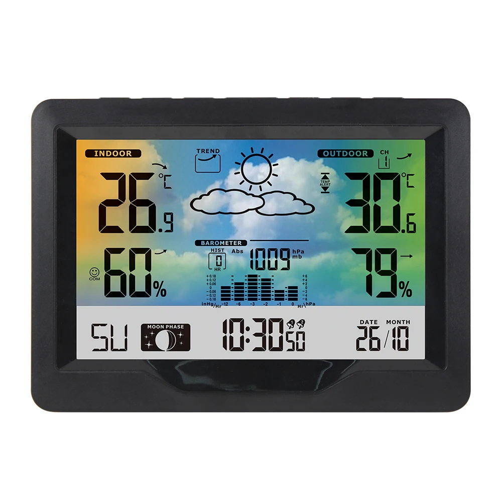 Универсальная Погодная станция-Используйте большой цветной ЖК-экран для отображения дополнительной информации, которая вам необходима: домашняя/наружная температура и влажность (макс./мин), настройка температуры и влажности (hi/lo) оповещения, время/дата/неделя, двойным сигналом показывающие внутреннюю/часы/повтор сигнала (за дополнительную плату 5 минут сна), vivid прогноз погоды; Фазы Луны являются элементами, барометрическое давление и уровень комфорта.