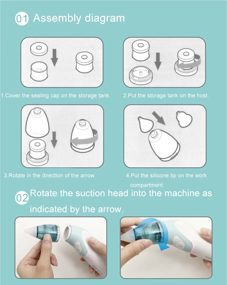 1. Накройте уплотнительную крышку на резервуар для хранения. 2. Поместите резервуар для хранения на хост. 3. Поверните в направлении стрелки. 4. Положите силиконовый наконечник на рабочий отсек.