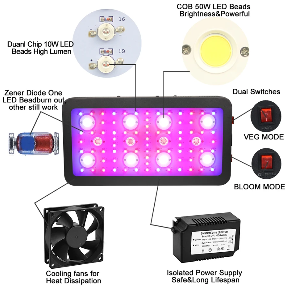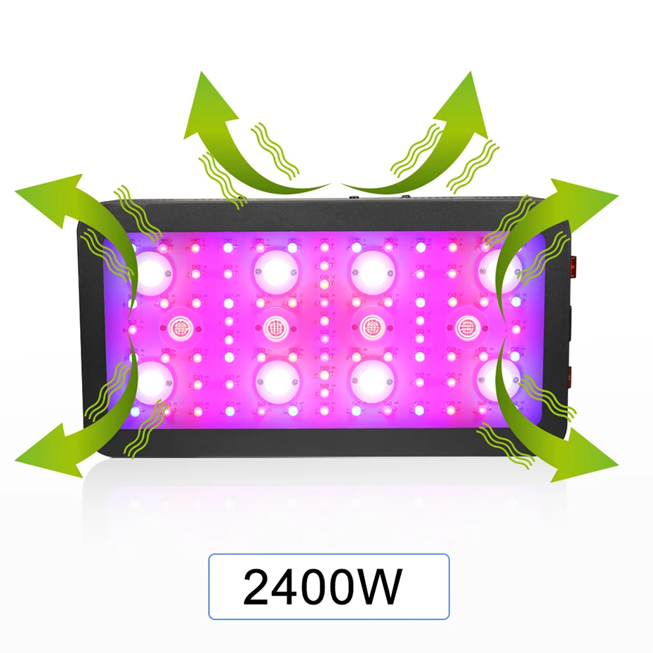 Подробное описание: 1). 2400 Вт Светодиодный светильник для выращивания, изготовленный металлический чехол, 72 шт. двойной набор микросхем 10 Вт и 12 шт. чипсет COB 10 Вт. Использование алюминиевой печатной платы и вентиляторов для рассеивания тепла, поэтому он может уменьшить вес светильник и обеспечить лучшее рассеивание тепла. 2). AC85 ~ 264V входное напряжение, удобный и безопасный, подходит для каждой страны. 3). Срок службы более 50 000 часов. 4). Конструкция цепи ромашки, более легкая для подключения ламп и увеличения освещения. 5). Встроенные вентиляторы 3 шт. для рассеивания тепла, супер бесшумные. У него длительный срок службы. Длина волны и пропорция цвета способствуют росту растений. 6). С CE & ROHS одобрением. 7). Функция таймера с ежедневным конкретным временем запуска Есть одна клавиша «Настройка» и пять индикаторный светильник s «ON», «9H», «12H», «15H», «18H», вы можете нажать кнопку «Настройка», чтобы зафиксировать светильник индикатора. Примечание: 1). Работает в нормальных условиях. 2). Не прикасайтесь к изделию или Не ударяйте его при работе. 3). Не водонепроницаемый, не капать воду. Применение: 1). Подходит для гидропоники, садоводства и теплицы. 2). Может заменить флуоресцентные лампы и натриевые лампы, подходящие для овощного сарая И ботанический сад. 3). Растущие лампы могут сделать цветок более длинным цветком, он используется для цветочной выставки. Посылка: 1x1200/W2400W светодиодный светильник для выращивания 1 x термометр с монитором влажности 1 х шнур питания 1 x Регулируемый Канат Металлический крюк-1 шт. 1 x Руководство пользователя 1 * стекло для выращивания
