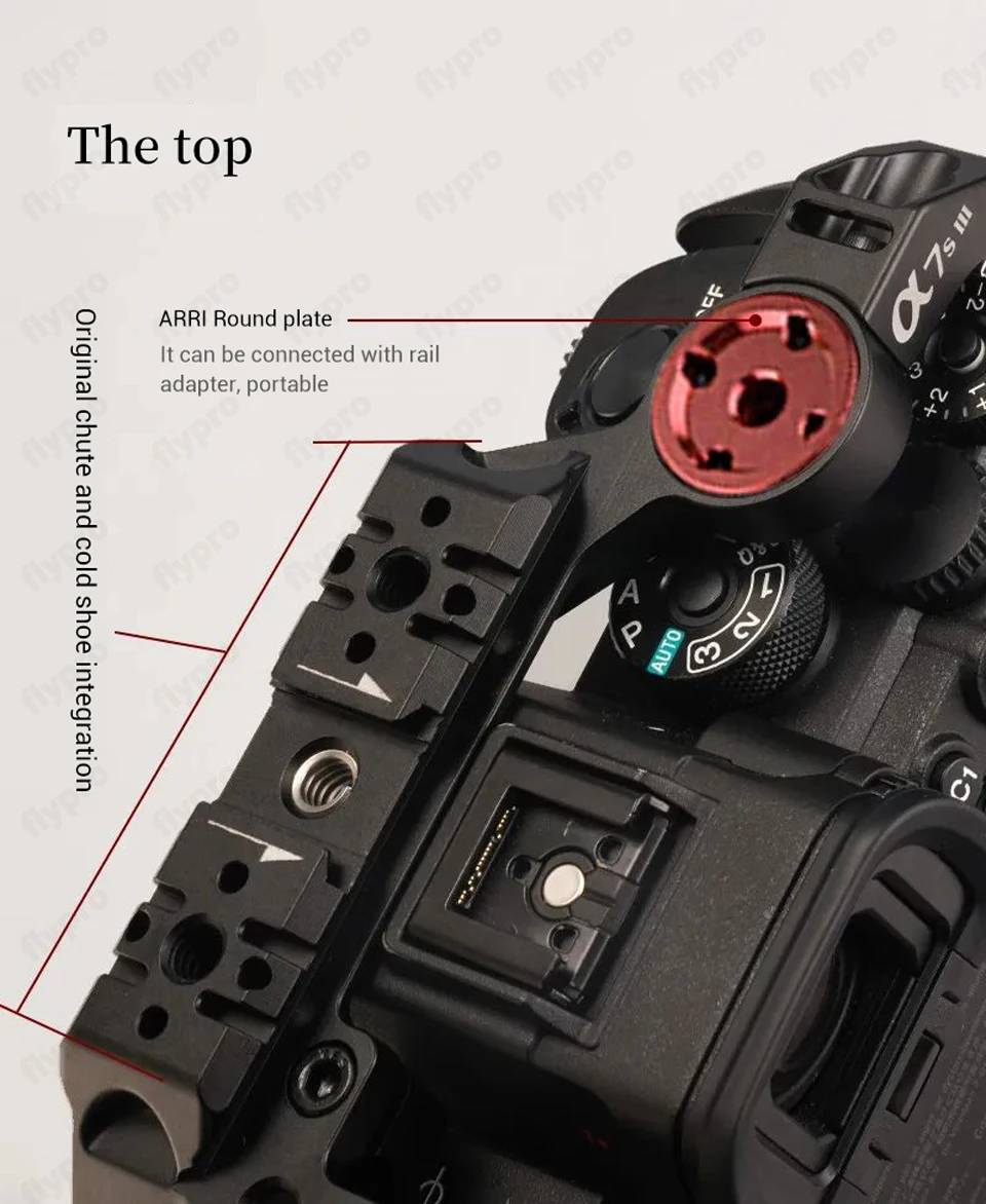 This "half" camera cage provides protective armor for the Sony a7S III camera. It provides several 1/4"-20 mounting points as well as one cold shoe mounting point. The base of the cage also provides several mounting holes when attaching your camera to gimbals to more easily fine tune the balance of your setup.