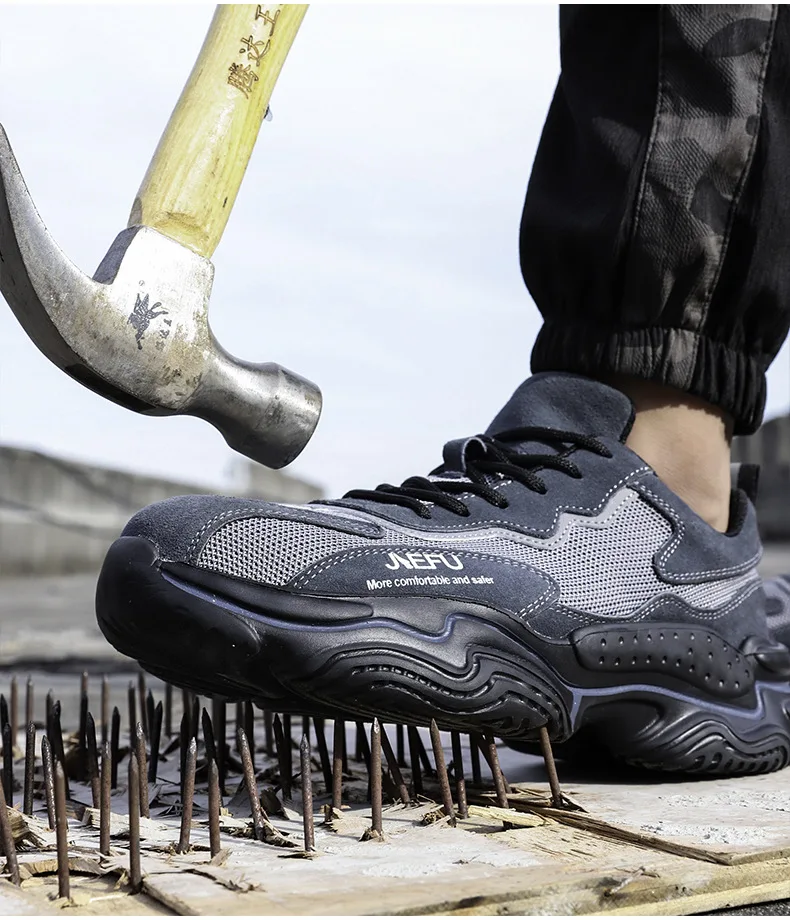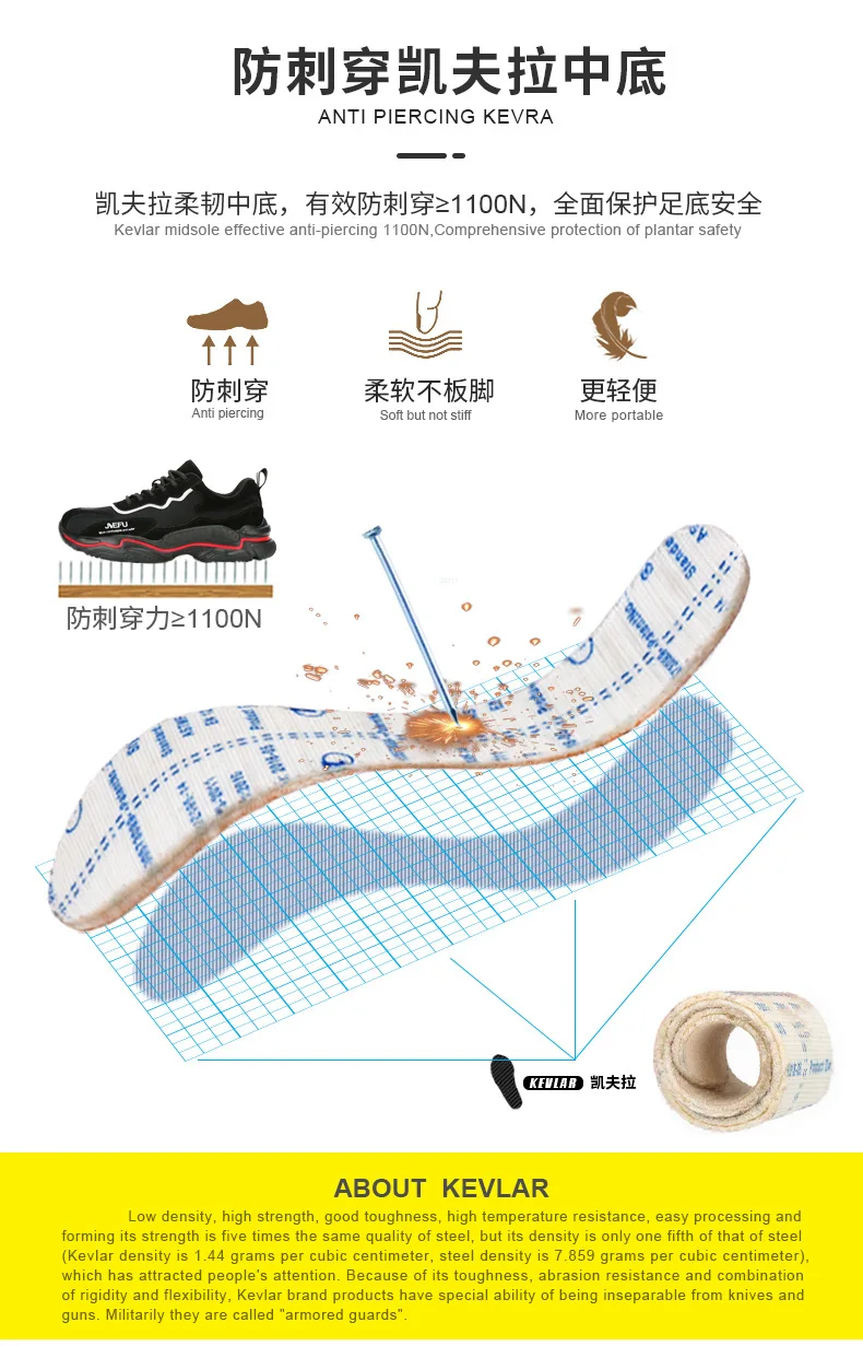 Промежуточная подошва из кевлара анти-прокол: Эта стальная обувь для носка изготовлена из кевлара, который является защитным волокном. Он может защитить ноги от проколов острыми предметами, такими как гвозди, стальной стержень.