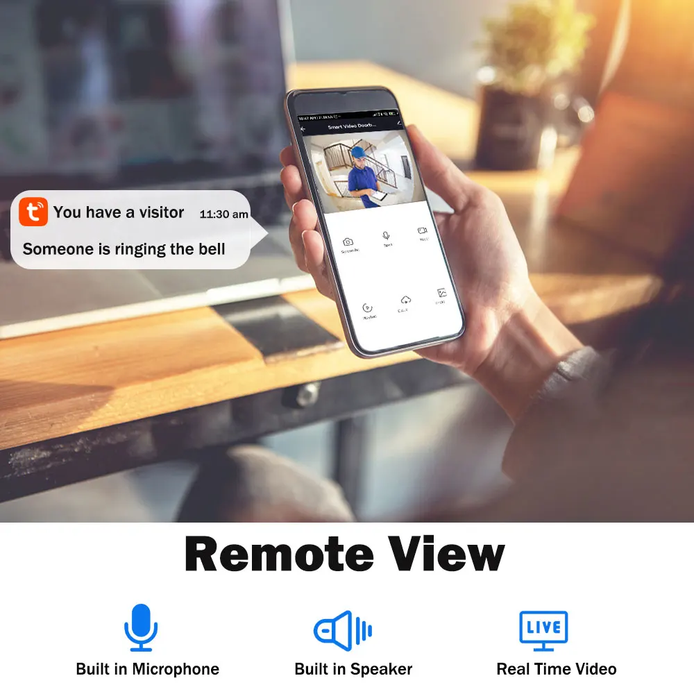 -Встроенный микрофон и динамик, поддержка реального Видео во времени, что позволяет вам общаться с вашим посетителем В режиме реального времени, где бы вы ни находились. -- Когда Посетитель нажимает звук дверного звонка Активируется, и камера начнет отправлять в режиме реального Отображение времени и вызов на мобильный телефон.