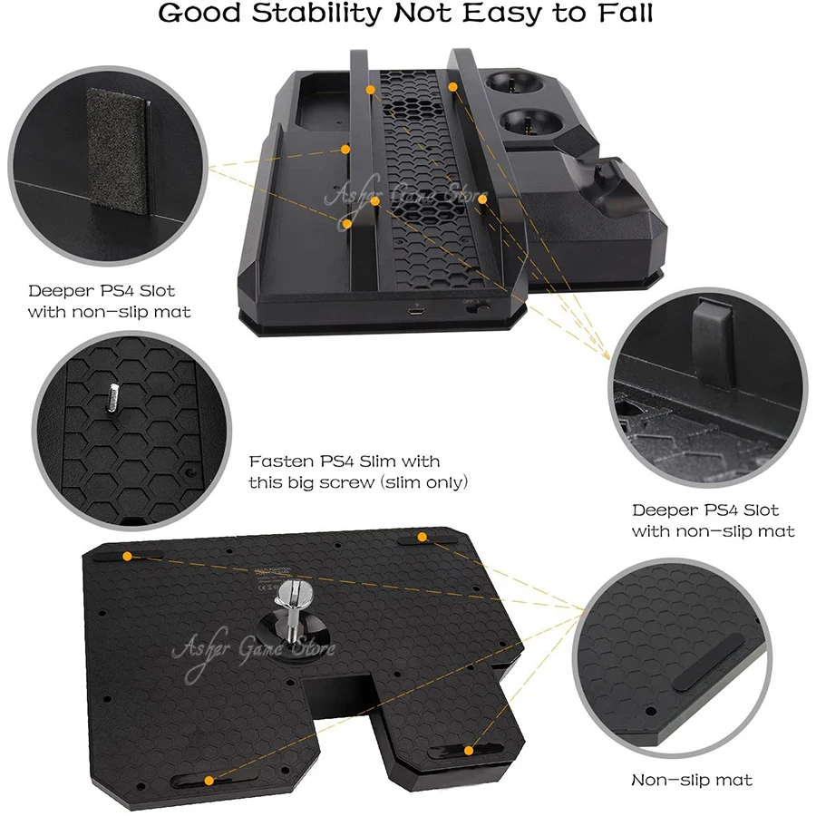 Двойные вентиляторы охлаждения с высокой скоростью вращения:Два встроенных высокоскоростных вентилятора кулера PS4 5000 об/мин добавляют больше воздуха, эффективно уменьшают рабочую температуру консоли PS4 и продлевают срок службы. С помощью кнопки off / L / H вы можете выключить вентиляторы или переключить скорость ветра соответственно. Все это делает лучшую вертикальную подставку ps4 slim pro с охлаждающим вентилятором с зарядным устройством.