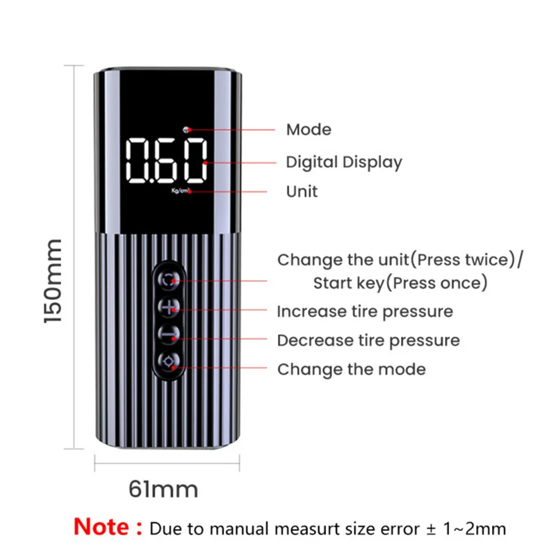 Благодаря проводному дизайну и компактному миниатюрному размеру этого шинного надувателя его легко носить с собой и легко управлять одной рукой. Вам нужно всего 4 шага, чтобы начать инфляцию. ЖК-дисплей sn показывает давление в реальном времени сбоку, так что вы можете контролировать давление без сгибания, чтобы увидеть дно.