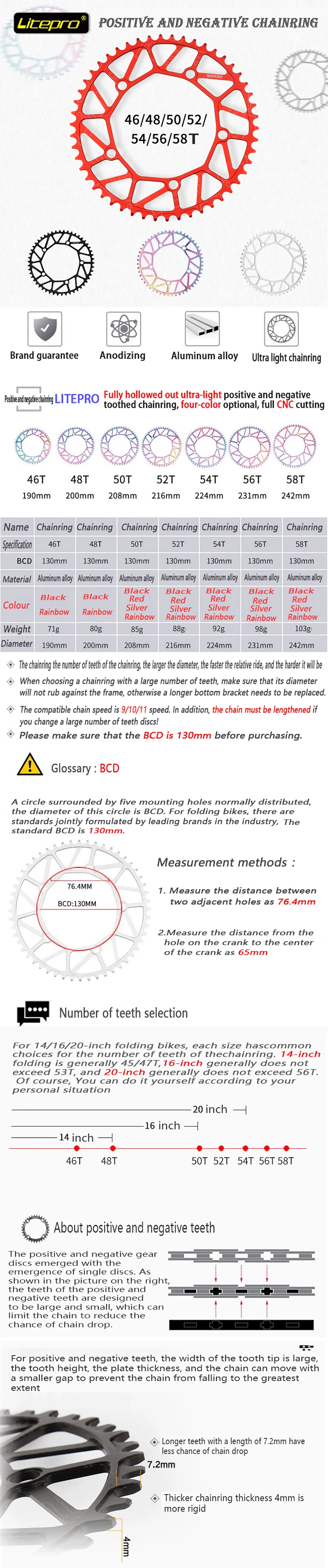 Litepro Folding Bike Chain Wheel ultralight Alloy CNC Single Disc Chainwheel 130BCD 46/48/50/52/54/56/58T Speed Hollow color BMX Chainring 9/10/11 Speed Chainwheel