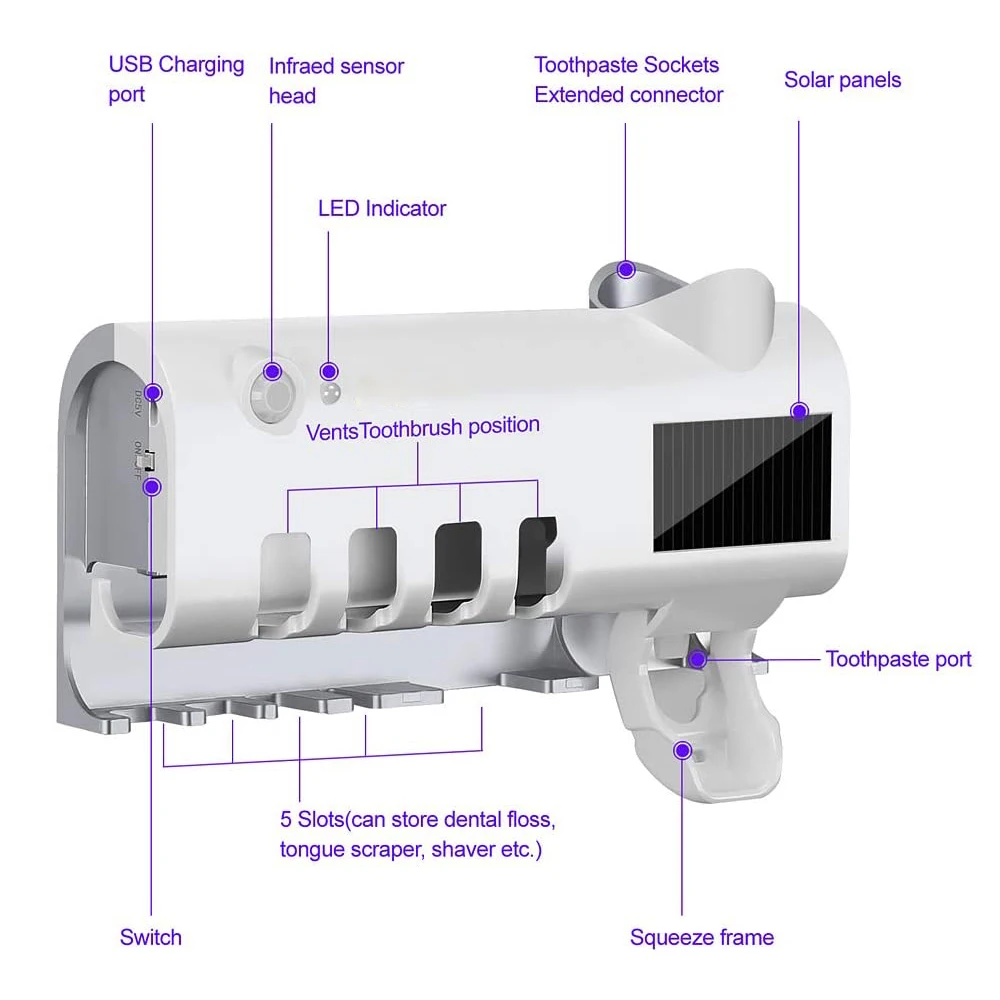 УФ стерилизатор зубных щеток, УФ-свет держатель стерилизатора зубных щеток, перезаряжаемая Солнечная энергия с автоматическим дозатором зубной пасты 【 Стерилизация 360 ° и непрерывная sanуф-дезинфицирующее средство для зубной щетки дает вам и вашим близким чистую зубную щетку и душевное спокойствие каждый день. Фотокатализатор распыляется в антиоксиданты зубной щетки и активируется фиолетовым светом в качестве непрерывного антимикробного вещества. 【Индукция человека 】 когда вы находитесь близко к держателю зубной щетки, чтобы активировать процесс, оставьте старт стерилизации, если вы снова близки, немедленно остановите стерилизации, защита безопасности человека 86FE 189 2764 9770 whatsapp стерилизатор держатель! 【Многофункциональная Подставка для хранения 】держатель для зубных щеток может получить 8 вещей для мытья полоскания полости рта, чтобы удовлетворить семью в использовании. Передний ряд дезинфицирующего средства для зубных щеток вмещает 4 зубных щетки, а второй ряд Вмещает 1 зубную нить, 1 бритву и 1 скребок для языка. Дизайн дозатора зубной пасты также очень очеловечен, вы можете разместить все виды зубной пасты, потому что мы дадим вам многофункциональный адаптер 【Energy saving】передовые аморфные кремниевые Тонкие Пленочные солнечные панели обеспечивают любой тип освещения для космических станций, включая естественное дневное освещение и внутреннее освещение, избавляя от необходимости прямого освещения, увеличение скорости преобразования света на 10% и увеличение времени работы держателя зубной щетки. Продукты изготовлены из толстого АБС-пластика; У вас есть идеальная станция для зубных щеток, чтобы обеспечить чистую ванную комнату, чистую зубную щетку, утварь и душевное спокойствие. Технические характеристики Рабочая температура: 0 ~ 50 ℃ Напряжение: 3,7 В постоянного тока Емкость аккумулятора: 1200 мА · ч Список продуктов 1 * держатель для зубных щеток 1 * Руководство пользователя 1 * Съемная задняя стенка 1 * Расширительных винтов 1 * Разъем расширения зубной пасты Способ применения 1. Стерилизатор зубной щетки-как установить? Можно ли установить стену или стекло? Пожалуйста, сначала откройте нижнюю бумагу задней панели клея на держатель зубной щетки, приклейте его на чистую стену, стекло или шкаф, И мягко прижмите его (опорная пластина приклеивается в течение 24 часов перед использованием удлиненного корпуса держателя зубной щетки), если это окрашенная стена, Его можно пробить и установить, и наш пакет оснащен винтами. 2. Стерилизатор зубной щетки-легко ли отвалится задний лист клея? Какой вес вы можете нести? Держатель для зубных щеток использует аутентичный США импортируют 3M клейкостью, который будет только для получения более подробной и завязать потуже. Задний лист клея был протестирован на ранней стадии развития, и может нести вес 5 кг и не будет падать.