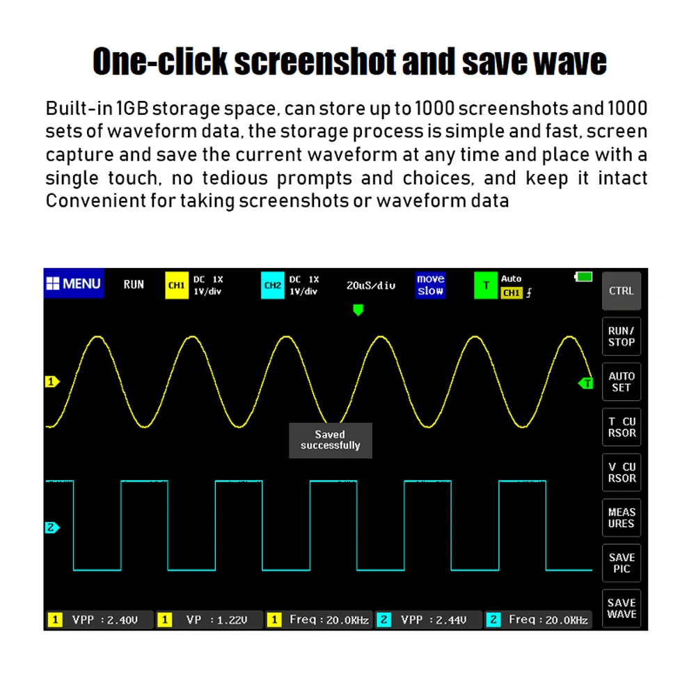 Функция измерения курсора, удобно вручную измерять период, частоту и напряжение.