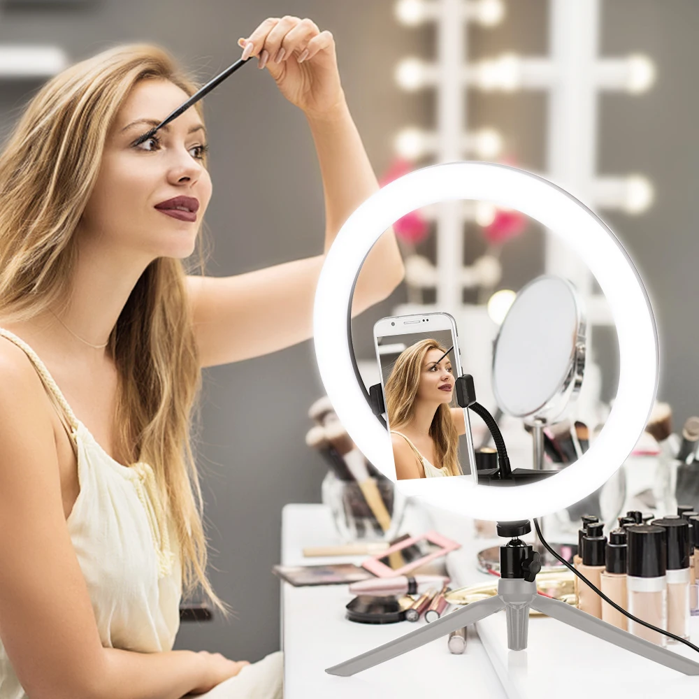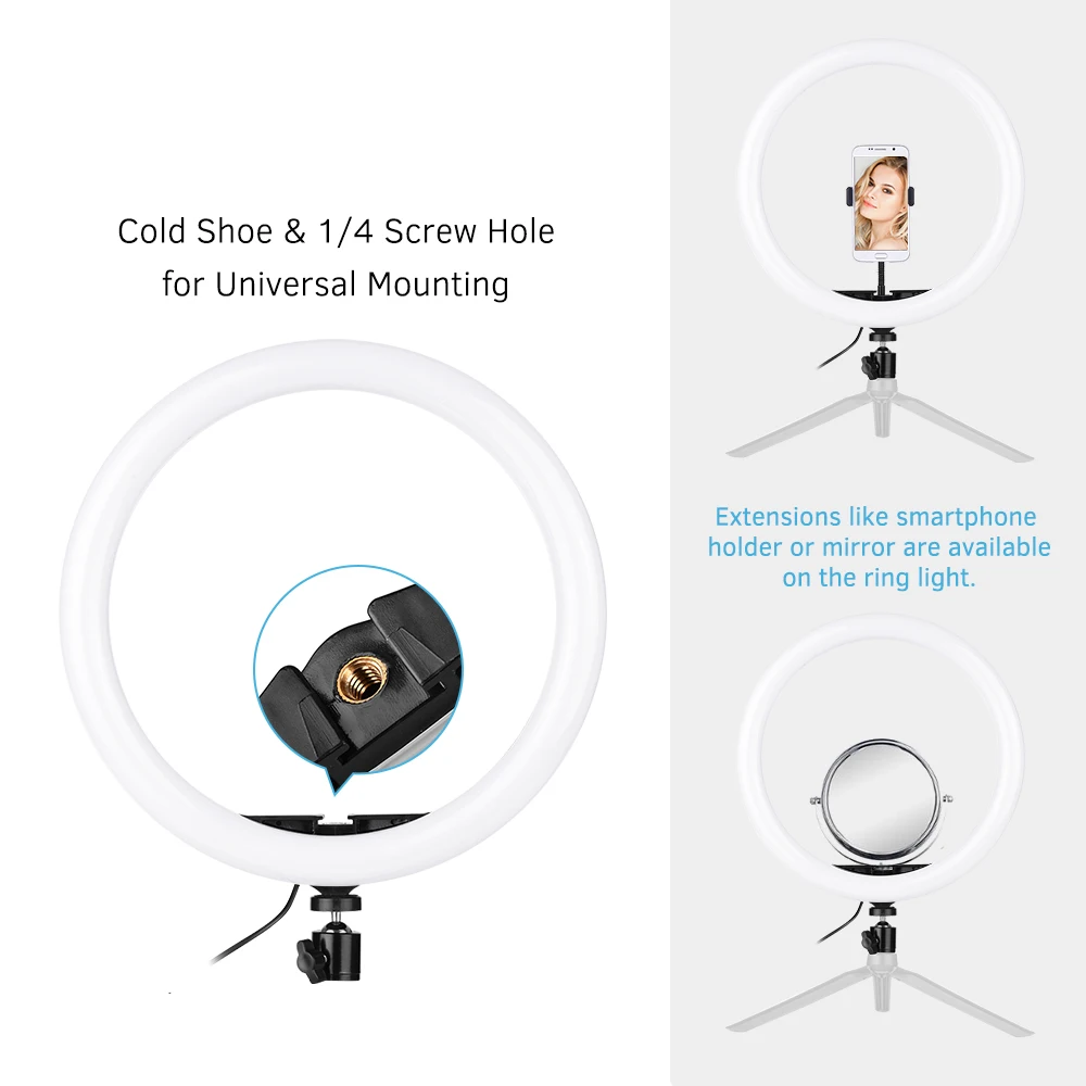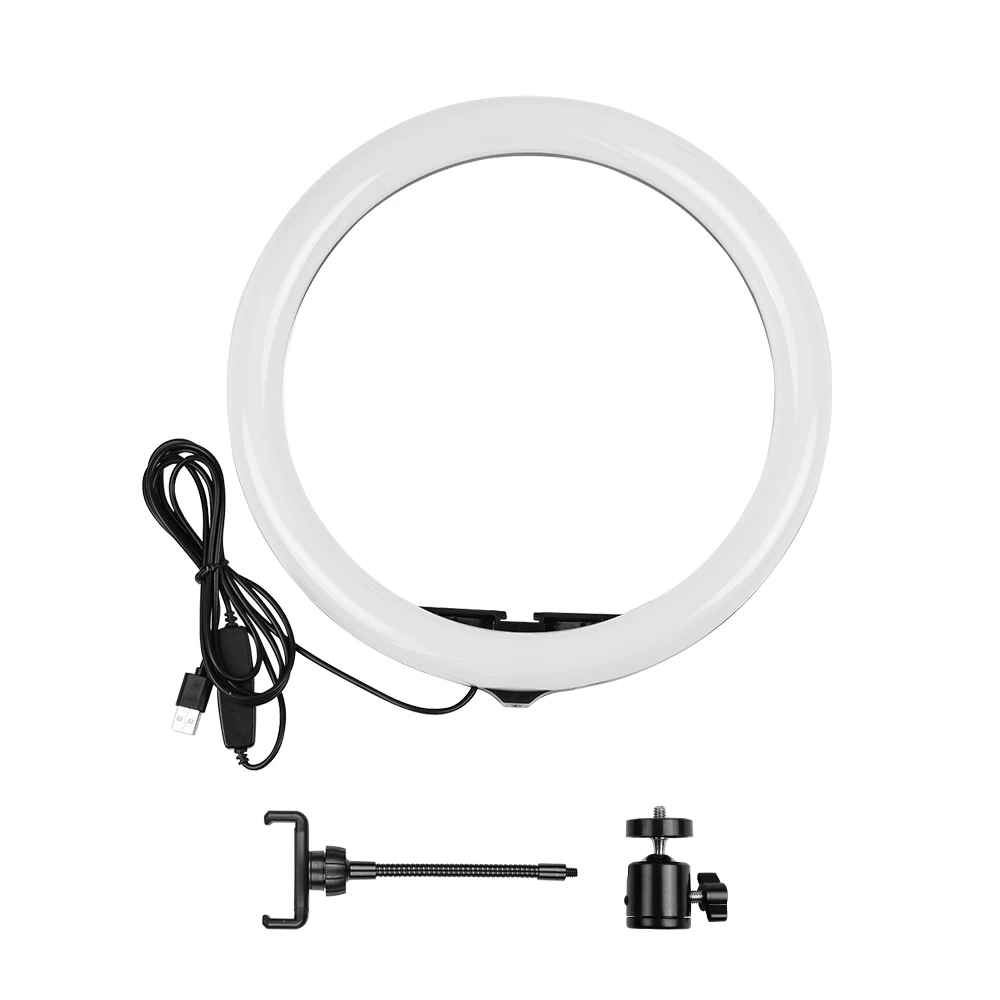 Вращающаяся шаровая Головка: Кольцевой светильник с вращающейся на 360 ° металлической шаровой головкой, вы можете свободно регулировать угол в соответствии с вашими потребностями съемки. Поставляется с подставкой для штатива и держателем для телефона, изготовленным из высококачественного пластика, портативного и легкого.