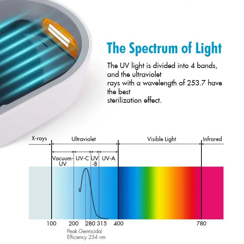 Технические характеристики Материал: АБС-пластик + Поликарбонат Цвет: белый Размер: 310*240*70 мм Вход: 5В 1а Выход УФ-светильник: 2 Вт (макс.) Длина волны УФ: 253.7нм Посылка в комплекте 1 x коробка стерилизатора 1 х USB кабель (Этот продукт не включает элементы, показывающие эффект коробки стерилизации.) Особенности Компактный и портативный, может использоваться дома, в офисе или автомобиле или для путешествий. Используйте ультрафиолетовый светильник, чтобы эффективно убить или инактивировать бактерии Подходит для мобильных телефонов, масок для рта, iPod, MP4, наушников, детских игрушек, зубных щеток и т. д. Откройте крышку, чтобы автоматически выключить ультрафиолетовый светильник, который является более безопасным. Убивайте 99.99% бактерий одновременно, часто дезинфицируйте и держите подальше. -18-минутный быстрый режим Короткое нажатие один раз, звуковой сигнал звонит один раз, и зеленый светильник включен. -30-минутный стандартный режим Короткое нажатие дважды, звуковой сигнал звонит дважды, и синий светильник включен. -Процесс дезинфекции завершен Три "Капли" слышны, и свет выключен. Дезинфекция завершена. -Режим дезинфекции выхода Нажмите и удерживайте кнопку питания более 3 с, и отпустите кнопку после кольца зуммера.