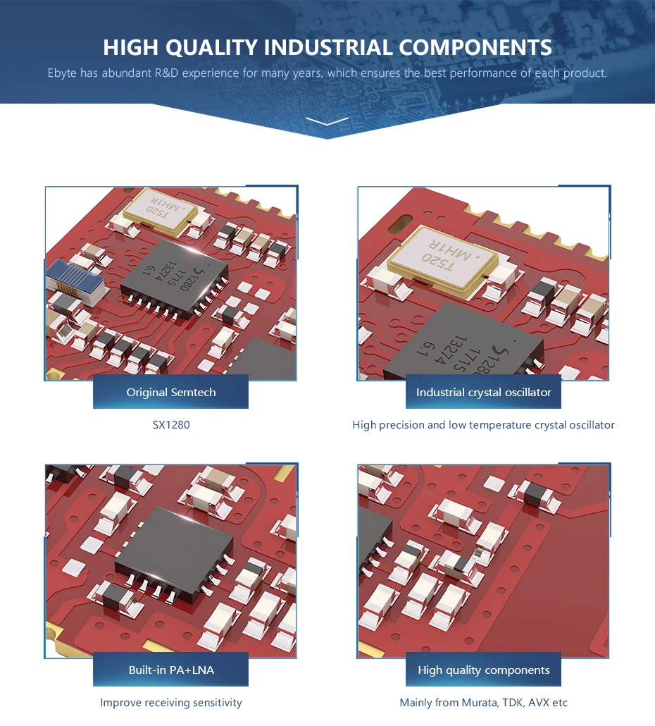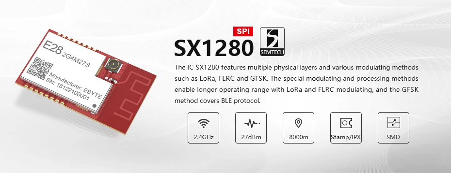 [Введение]:E28-2G4M27S представляет собой 2,4 ГГц маленький модуль поверхностного монтажа (pin шаг 1,27 мм) Разработанный Чэнду Ebyte. Со встроенной антенной PCB, SPI интерфейсом, он имеет мощность TX 500 МВт с энергопотреблением.