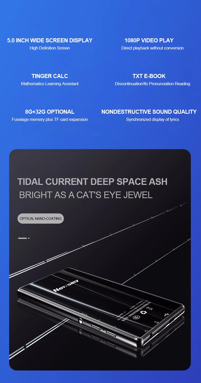 Размер памяти продукта: 8 г Поддержка TF-карты до 64 ГБ Размер: 128,5*67,3*8,9 мм Размер экрана: 5,0 дюйма Емкость аккумулятора: 1650 мАч Порт зарядки: Type-C Разрешение: 960*480 Формат видео: RMVB/MP4/AVI/RM/MPG/MOV/TS Формат фотографии: JPG/PNG/BMP/GIF Формат музыки: APE/FLAC/WAV/MP3/OGG/AMR