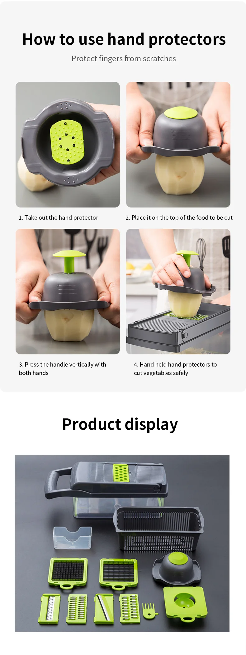Продукт: овощерезка Myvit со стальным лезвием, мандолин, овощерезка для картофеля, морковный сыр, Овощная терка, кухонные принадлежности Кухонный помощник: Этот ручной слайсер изготовлен из пищевой нержавеющей стали и АБС-пластика без BPA. Он предлагает все функциональные возможности нескольких приборов со сменными нержавеющими лезвиями. Эти лезвия можно разрезать через все виды овощей, терка сыра, нарезка картофеля и резки фруктов, даже можно создать пастообразные овощи или пюре. Хранение сбоку: у него есть собственный контейнер для лопастей, чтобы положить, никогда не терять их или тратить время на поиск Экономьте время и деньги: С помощью этого кухонного режущего набора вы можете сэкономить 70% времени, попрощайтесь с водяными глазами, когда нарезаете лук; И поможет вам подготовить еду более элегантно.