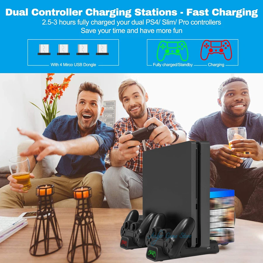 【Зарядная станция с двумя контроллерами 】Эта охлаждающая подставка PS4 имеет 2 станции для зарядки контроллеров. Быстрая зарядка в течение 2,5-3 часов. Благодаря световым индикаторам состояния спереди вы всегда будете знать, когда ваши контроллеры полностью заряжены и готовы к использованию! Примечание: 4 микроадаптера находятся на охлаждающей подставке рядом со слотом для игральной карты.