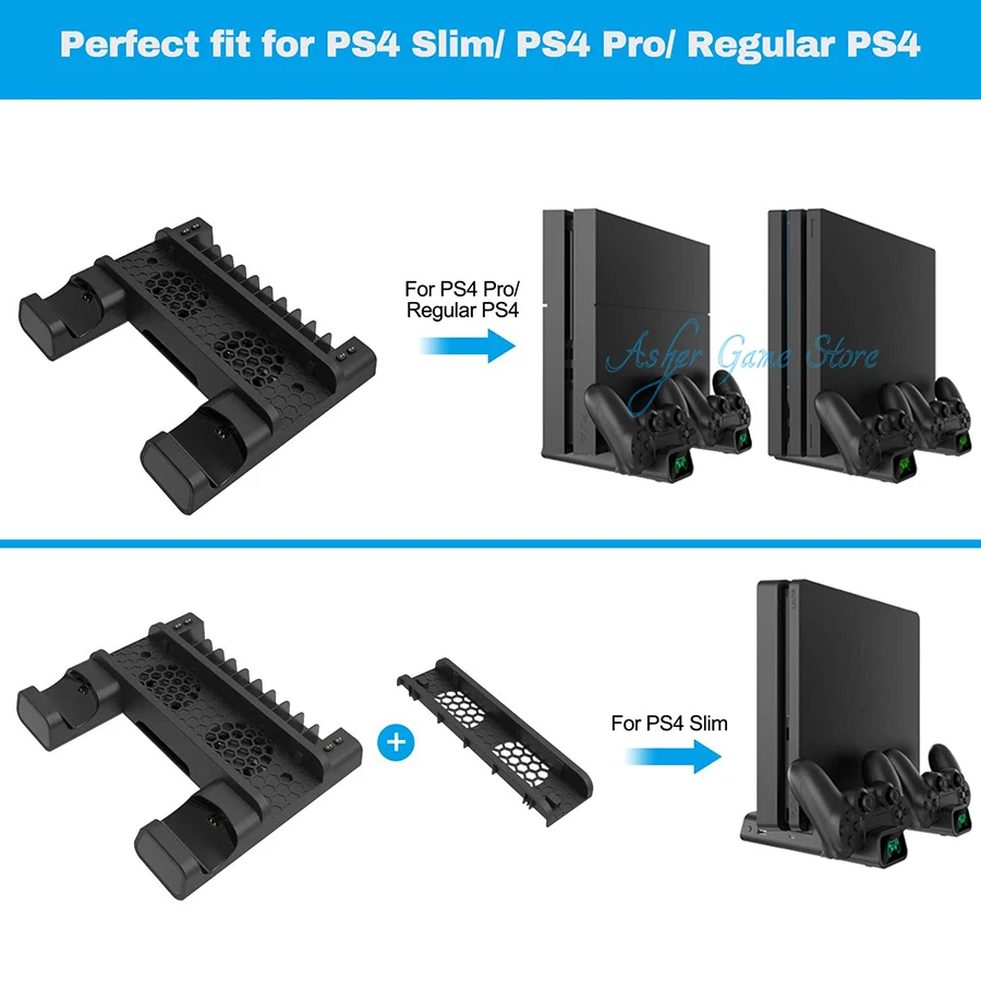 【Многофункциональный】Охлаждающая подставка PS4 позволяет управлять консолью очень эффективно. Он достаточно хорошо спроектирован, так как PS сидит вертикально, прямо посередине с контроллерами с одной стороны и коллекцией игр с другой. Хорошо совместим со всеми версиями PS4 (Standard, Slim и Pro).