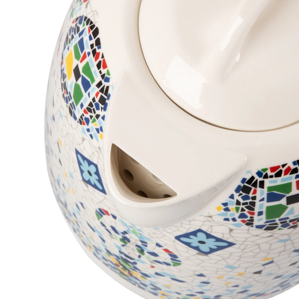 Особенности и дополнительные функцииКорпус из эко-керамики сохраняет полезные свойства воды, Беспроводное соединение позволяет вращать чайник на подставке на 360°, Дисковый нагревательный элемент, Автоотключение при закипании и отсутствии воды, Эргономичная ненагревающаяся ручка, Удобный носик для розлива воды, Стильный фиксатор крышки, Встроенный несъемный крупноячеистый фильтр для сбора накипи