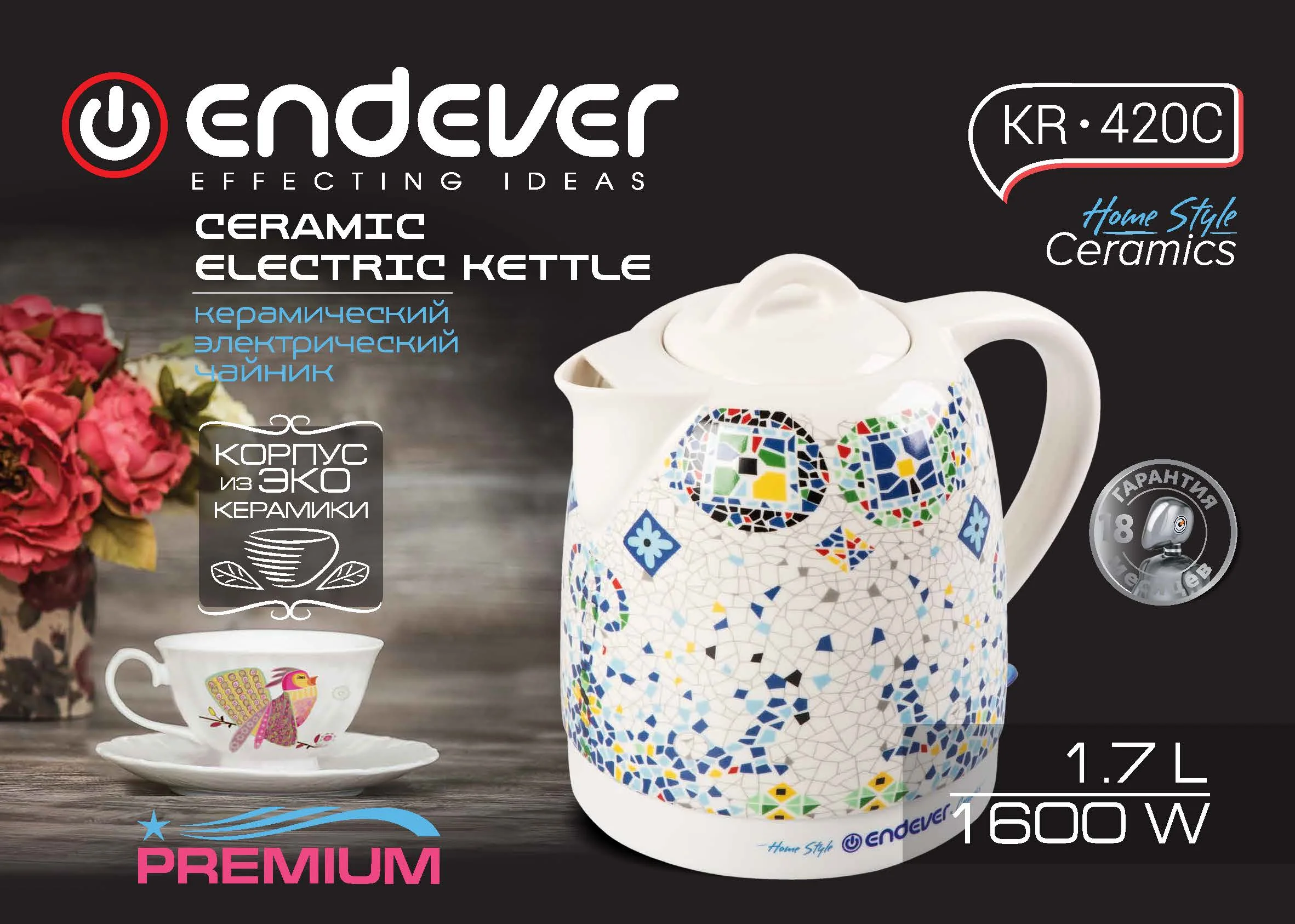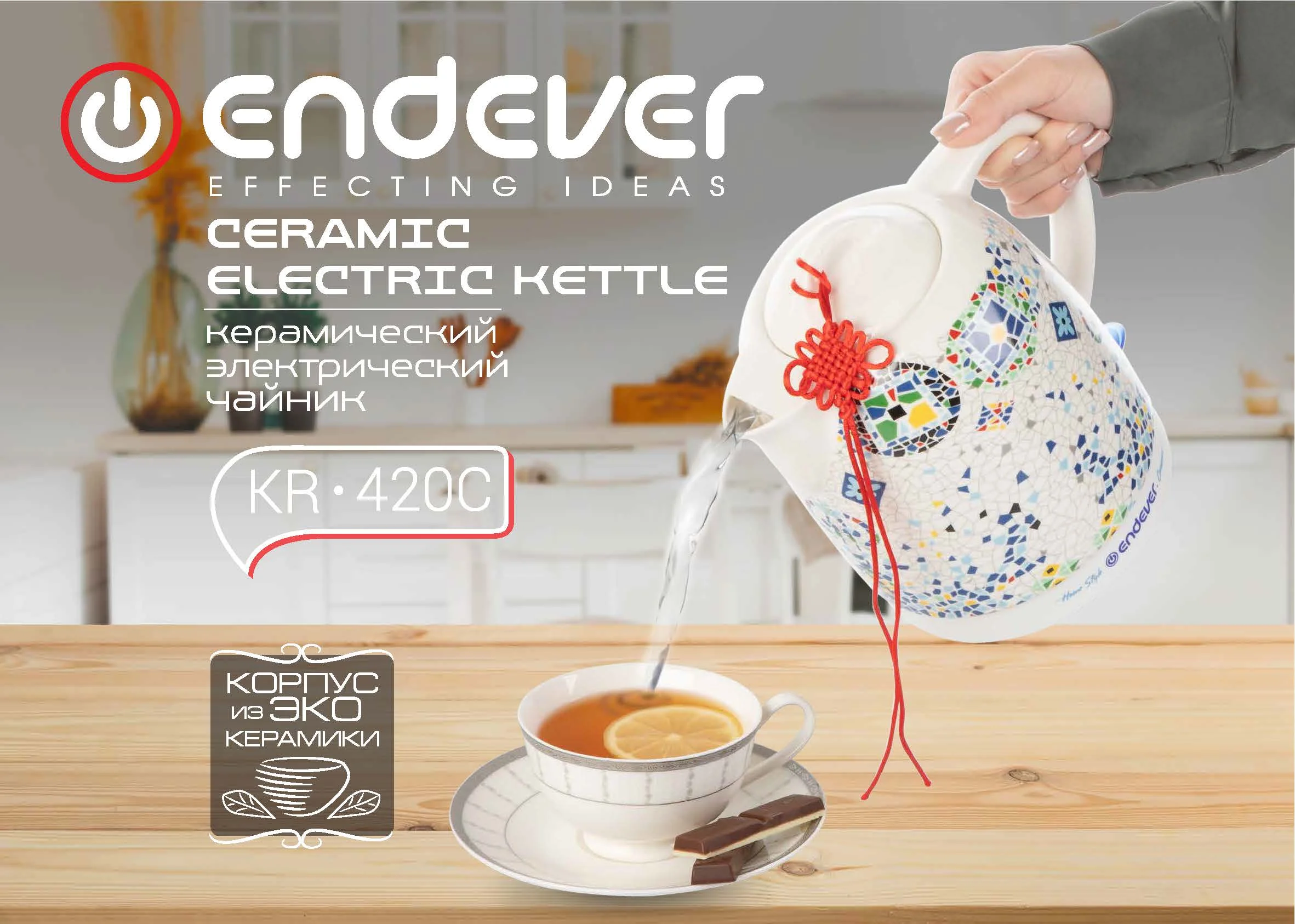 Корпус электрического чайника Endever выполнен из керамики, которая послужит гарантом долговечности использования и сохранит оригинальный вкус вскипяченной воды (без посторонних запахов и привкуса).