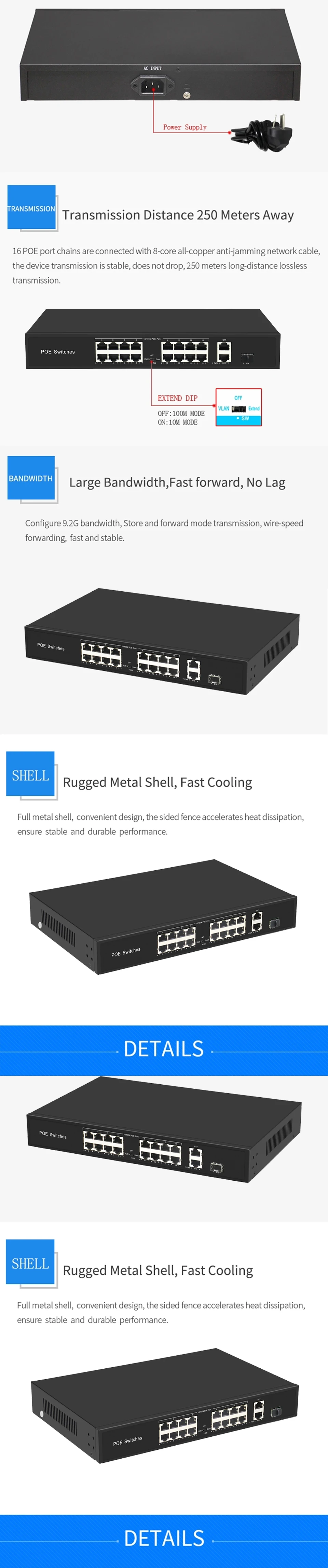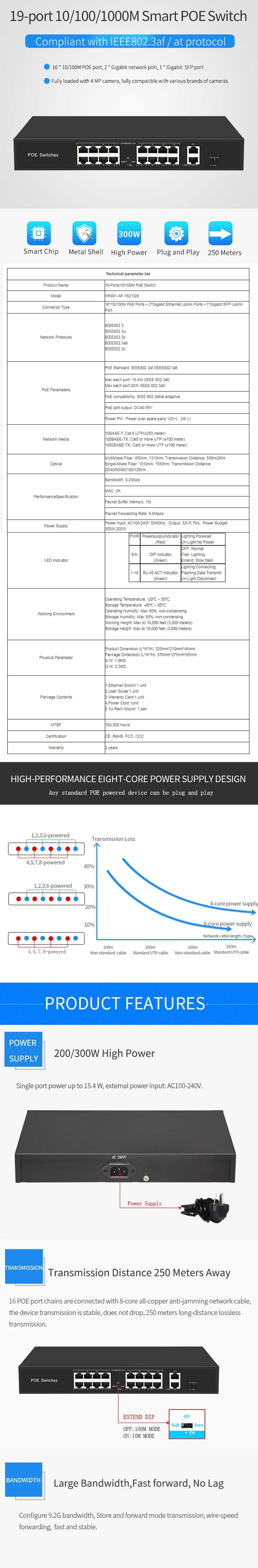 16POE один порт до 1000 м медный кабель RJ45 порты поддержка MDI/MDIX: 1. Поддержка беспроводной точки доступа (AP) и сетевых камер наблюдения, питающихся от кабеля Ethernet категории 5 2, от 1 до 16 портов Поддержка стандарта IEEE802.3af/at источник питания 3, 10/100 Мбит/с адаптивный RJ45 POE порты, с функциями VLAN для 250 метров регулируемый 4, в соответствии со стандартом IEEE 802,3 10Base-T и IEEE 802.3u 100Base-TX 5. Режим управления потоком: полный дуплекс принимает стандарт IEEE 802.3x, полудуплекс принимает стандарт обратного давления 6. Автоматический Флип с поддержкой порта (Auto MDI / MDIX) 7. Вся мощность машины: более 300 Вт 8, максимум 30 Вт на порт 9. Переключение системы с помощью магазина и вперед 10. Все порты поддерживают переключение скорости линии, скорость линии может достигать в пределах 64 ~ 1536 длины кадра 11, Охлаждающие отверстия с обеих сторон, с охлаждающим вентилятором для лучшего рассеивания тепла и более длительного срока службы 12, различные способы установки, рабочий стол, шасси, настенный подвесной 13. Функция нулевой конфигурации автоматически поставляется на Адаптивное устройство