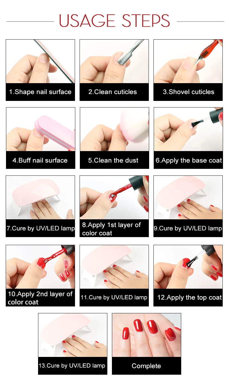 Высушите светодиодный Ной лампой в течение 60 секунд или УФ-лампой в течение 2 минут.