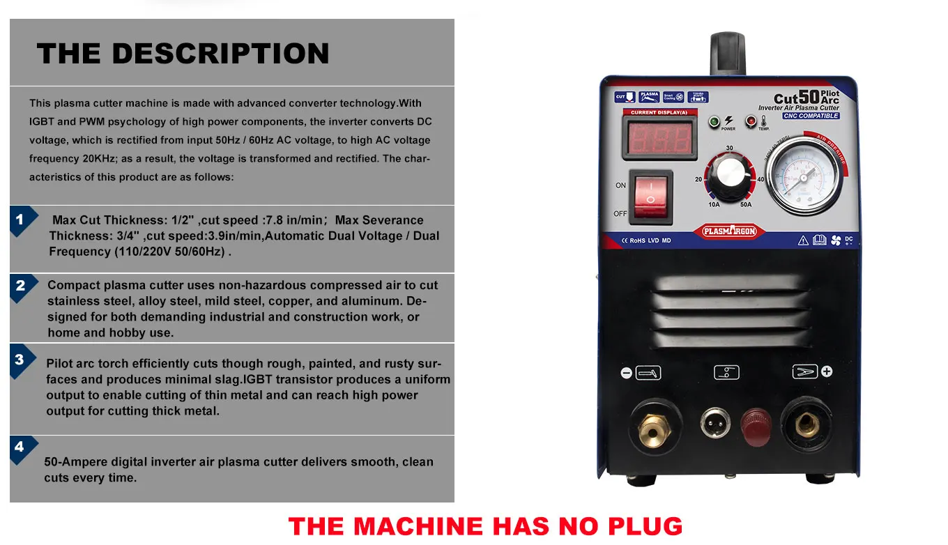 Вход мощность напряжение (В, Гц):1-этапа ac110/220V 50/60Hz (у нас также есть 220V машины, если вам нужен один напряжения машины, пожалуйста, выберите 220 В при размещении заказа) Мощность входного сигнала: 10 Диапазон тока: 20-50 Выходное напряжение: 104 Максимальная выходная Толщина: 3/4" Максимальная толщина резки: 1/2" Потеря без нагрузки: 50 Коэффициент мощности: 0,85 Дуга-Пуск: не-тач Класс изоляции: F Класс защиты: ip21 Обратите внимание: Поскольку наши машины продаются в разных странах, они не оснащены вилками.
