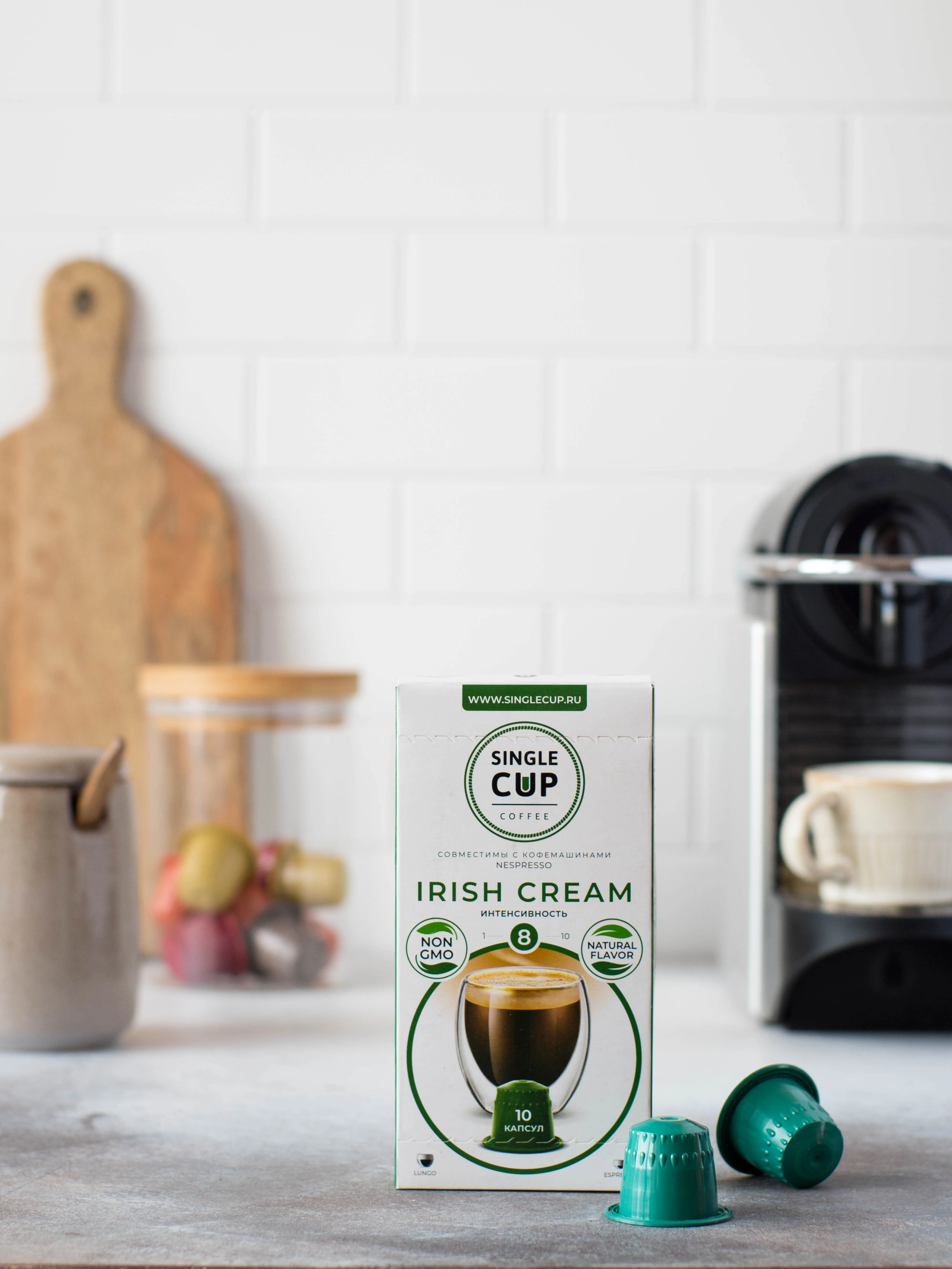 Ставшее классикой сочетание вкуса Сливок и Ирландского виски с кофе. Яркий, но не навязчивый аромат Ирландских сливок прекрасно гармонирует с насыщенным и выраженным вкусом кофе. Для создания ароматизированного кофе мы использовали высококачественные ароматические композиции, в состав которых входят натуральные компоненты и экстракты, для придания напитку еще более глубокого и яркого вкуса. За основу мы взяли арабику из Центральной Америки темной степени обжарки, чтобы сделать ее вкусовое сочетание со вкусоароматическими компонентами еще более гармоничным и сбалансированным. Капсулы single cup подходят для кофемашин системы Nespresso Original (Неспрессо Ориджинал) формат капсул Nespresso (Неспрессо)