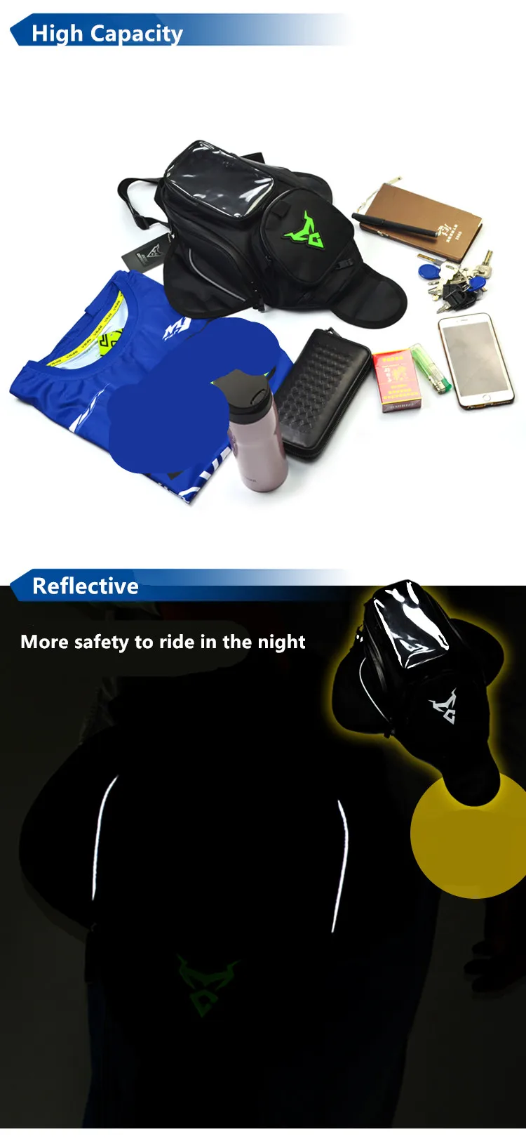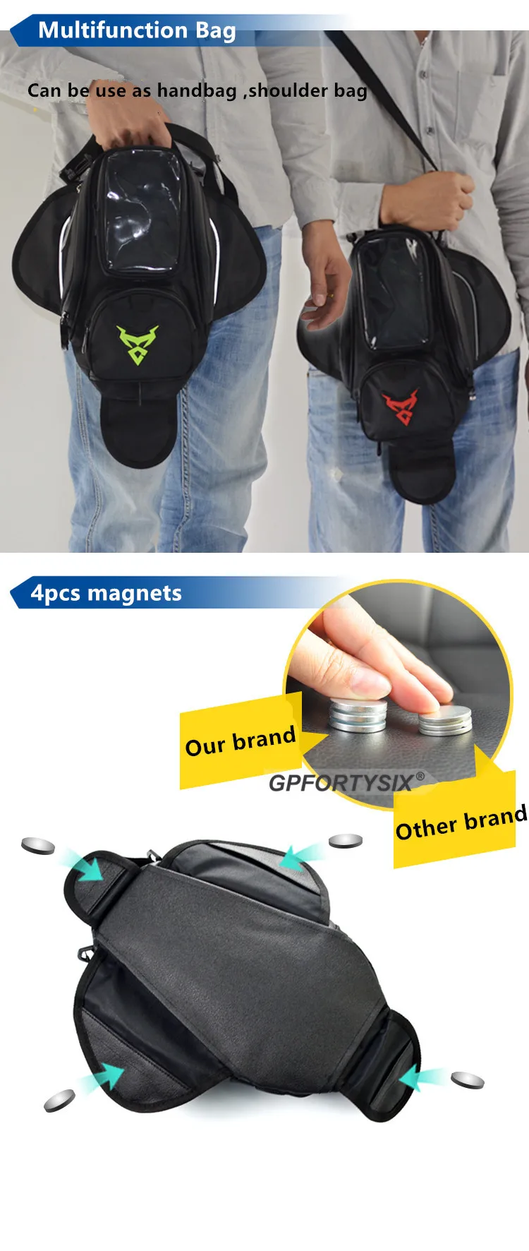 Есть 3 различных типа сумок топливного бака, все из которых являются магнитными. Сумки могут содержать электронные продукты, такие как мобильные телефоны, IPad и GPS.
