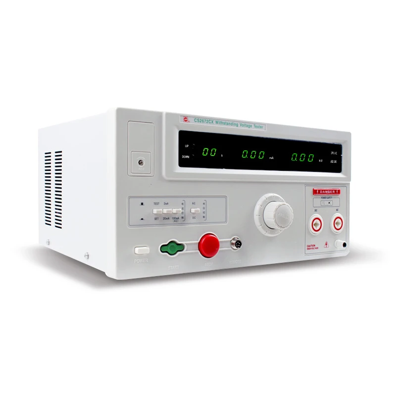 CS2672CX 5kV 100mA AC и DC Выдерживает испытание напряжения er/Hipot тест er(ACW/DCW тест: 0 ~ 5kV AC/DC,0 ~ 20mA DC,0 ~ 100mA AC)Краткое введение:1. Высокое напряжение, низкий ток, точность измерения2. Непрерывная Настройка тока утечки и тестового времени, хорошая адаптируемость3. Отображение проверенных реальных значений одновременно (время, напряжение, ток), и звуковой и визуальный сигнал с дисквалификацией4. Защита от поломки высокого напряженияИнструмент может служить несколько целей, например, выходной ток порта постоянного тока может осуществить Испытание на выдерживание напряжения и тока утечки конденсатора, обратное напряжение и обратный ток утечки высоковольтного кремниевого стека и транзистора и т. Д.5. Отображение времениТри цифровой дисплей труб, максимальное время теста может быть до 999s, минимальное время-0,1 s.6. Предварительный набор времениДля серии cs267xнажмите клавишу вверх или вниз, чтобы увеличить или уменьшить значение предварительно установленного времени.7. МЕТОД ПОДСЧЕТА времениДля тестера серии CS267X hipot, если предварительный набор времени установлен до 0, тестер подсчитывает время тестирования; Если тестовое время не установлено до 0, затем тестер отсчитывает время. (Например, если тестовое время установлено до 60 с, то тестер будет делать тест до тех пор, пока время не будет отсчитываться до 0)8. Выходной индикатор высокого напряженияДля тестера hipot CS267Xseries на передней панели есть индикатор опасности. Индикатор высокого напряжения будет светильник до тех пор, пока есть высокое напряжение в выходном терминале высокого напряжения. Индикатор не контролируется основной схемой, которая защищает оператора.9. Интерфейс PLC9-контактный разъем интерфейса PLC, может контролировать тест, сброс, при тестировании, не (сигнал тревоги), пройти сигнала удаленно. Контактный сигнал стабильный и простой в захвате.Технические условия:Акв: Испытание на напряжение переменного тока. Относится к испытанию на Выдерживаемое Напряжение испытательного объекта с использованием переменного напряжения.DCW: Испытание на напряжение постоянного тока. Относится к испытанию на Выдерживаемое Напряжение испытательного объекта с использованием однонаправленного напряжения постоянного тока. Высокое напряжение на выходе этого инструмента является положительным высоким напряжением электрического сигнала.Характеристики: