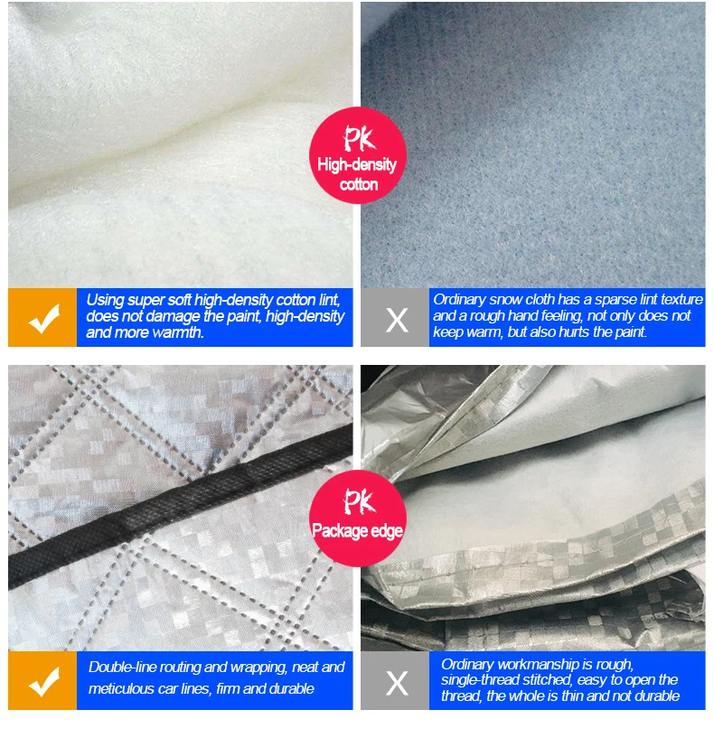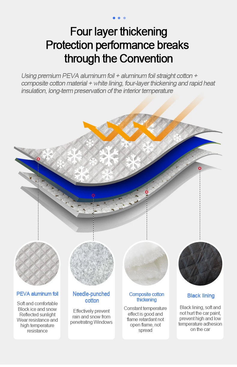 【Product packaging】: 1pcs/handbag (packaged in an opp bag with a door) 【Product material】: PEVA aluminum foil + needle punched cotton filling + composite material + lining 【Product features】: 1. Aluminum film material, no damage to car paint, sun protection, heat insulation, rain and snow, wind and dust, scratches, UV, and strong tensile strength. 2. Inner non-woven fabric: soft non-woven fabric can better protect the paint and prevent the paint from being scratched.