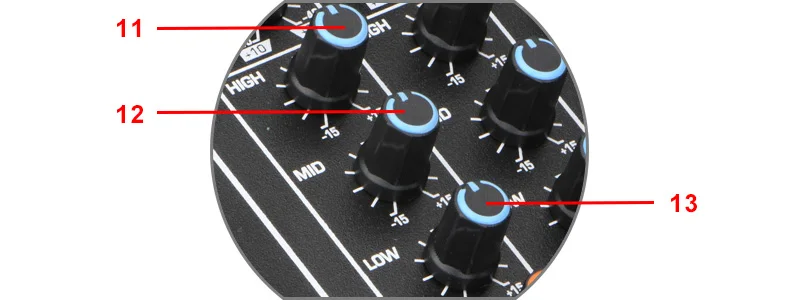 3-полосный эквалайзер 11. Высокий Высокочастотный диапазон обеспечивает высокий уровень управления. 12. Средний Среднее управление может использоваться для увеличения/резки частот среднего диапазона. 13. Низкий Низкое управление позволяет поднять или понизить коэффициент усиления басового диапазона.