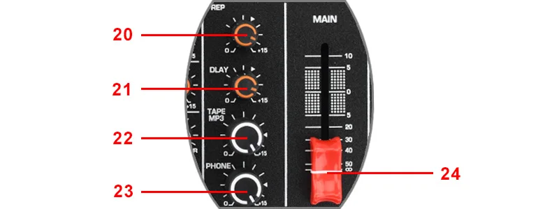 20. Репетиция: Используется для регулировки частоты повтора эха. Так как слишком много повтора эха может вызвать вой. Правильно Отрегулируйте частоту. 21. Задержка Используется для регулировки временного интервала повтора эха. Наиболее эффективным может быть положение средней позиции 5. 22. Лента/MP3 Регулировка громкости с ленты/MP3. 23. Управление телефонами Регулирует громкость наушников. 24. Главный фейдер Используйте главный фейдер для установки общего уровня громкости вашей машины.